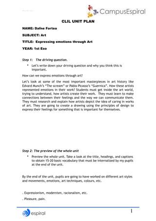 This document outlines the steps for a CLIL (Content and Language Integrated Learning) unit plan for an art class focusing on expressing emotions through art. The unit will have students explore how famous artists like Edvard Munch and Pablo Picasso expressed emotions in their work. Students will research artistic styles, techniques, and emotions. They will create their own drawings to express feelings and present their artwork. Key vocabulary like art movements, colors, and emotions will be learned. The hardest part will be creating original artwork, while identifying emotions in pictures will be easiest. The unit integrates language, arts, and social science skills while developing creativity, expression, listening, and teamwork.