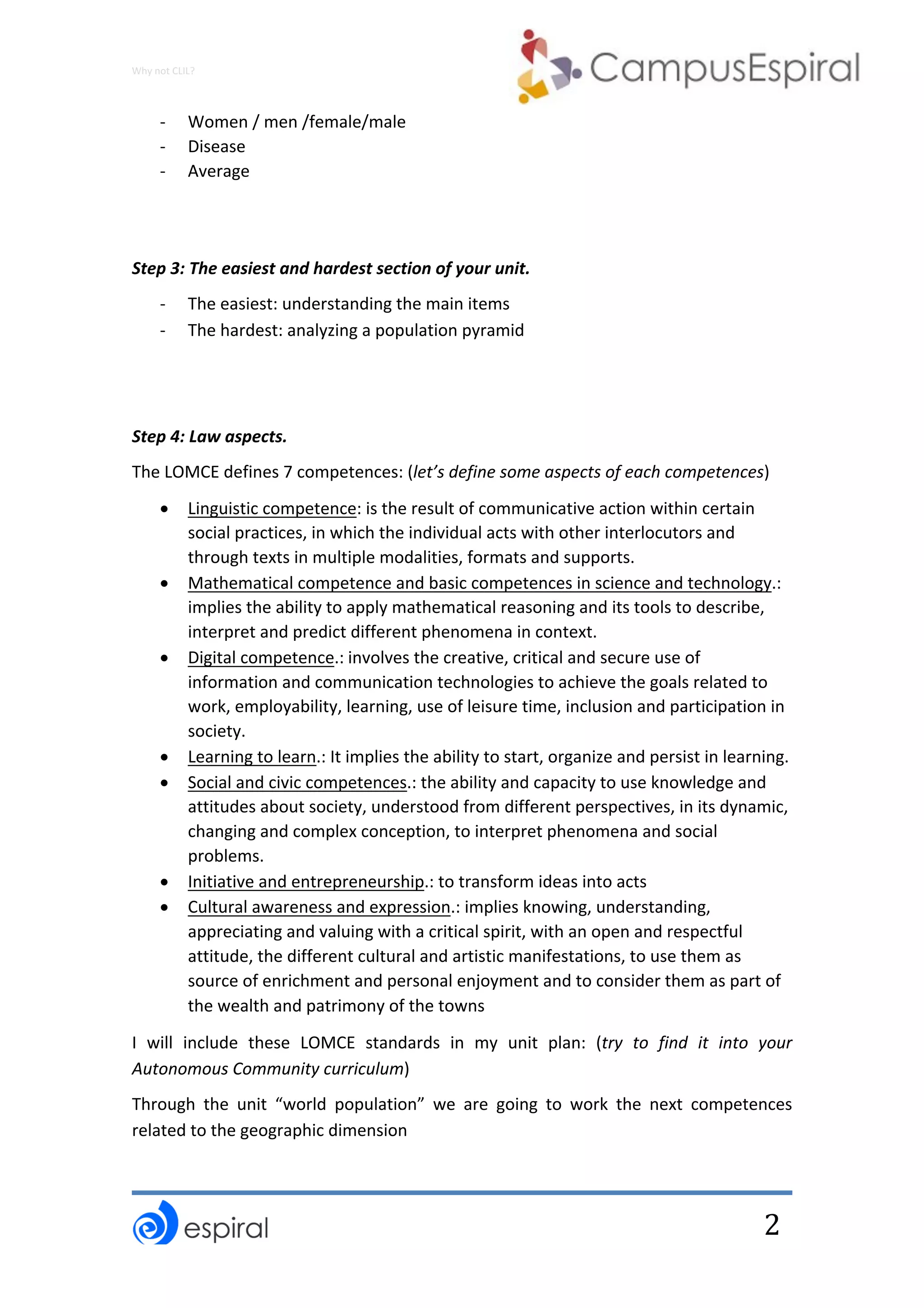 This document outlines the steps in planning a CLIL (Content and Language Integrated Learning) unit on world population for a 2nd year ESO (secondary education) social science class. It includes defining the driving question, previewing unit content and vocabulary, identifying the easiest and hardest sections, connecting to curriculum standards, and considering how to incorporate interdisciplinary topics and soft skills. The goal is for students to understand issues around whether Earth's population limit will be reached and to work on competencies related to geography including analyzing population data and models of territorial organization.