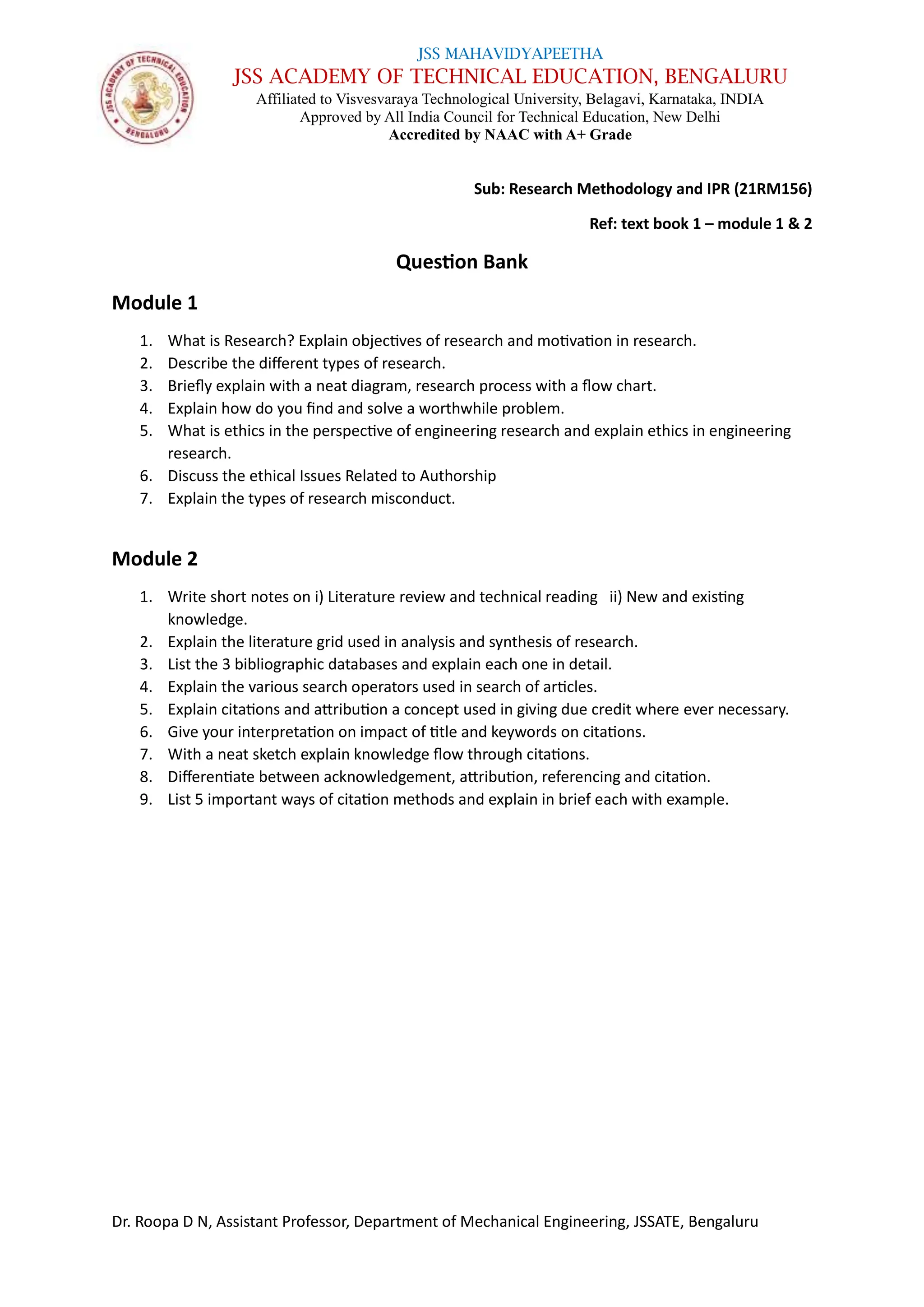 The document outlines a question bank focused on research methodology and intellectual property rights for a course taught by Dr. Roopa D.N. at JSS Academy of Technical Education. It includes questions on research objectives, types, processes, ethical considerations, literature review, bibliographic databases, search operators, and citation methods. The content is structured into two modules, providing a comprehensive overview for students in the mechanical engineering field.