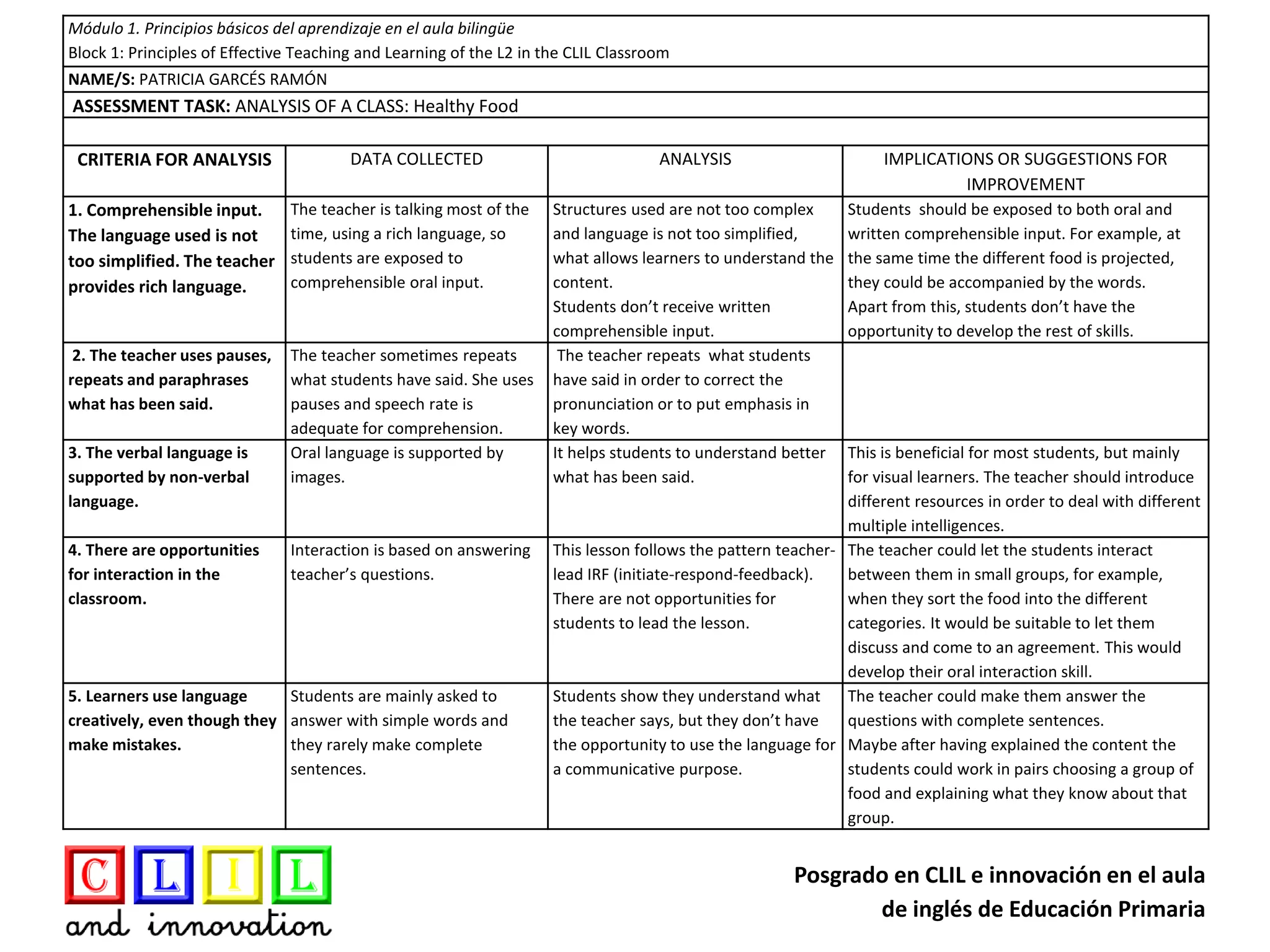 The document analyzes a classroom session on healthy food taught in English. It evaluates the session based on 11 criteria for effective CLIL teaching. The analysis found that while the teacher provided comprehensible input through images and repetition, students had limited opportunities to actively and creatively use English. It suggests giving students more opportunities to interact, produce language in pairs and groups, and participate in authentic communication activities to develop their oral skills.