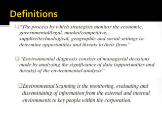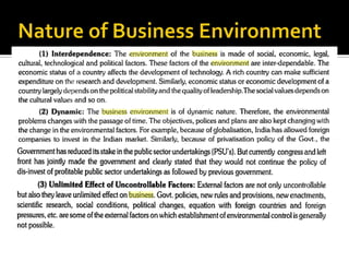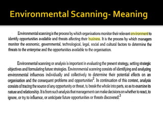 The document defines business environment as the set of external and internal factors that influence business decisions. It discusses the micro and macro environment. The micro environment includes factors directly related to the business such as suppliers, customers, and competitors that the business can control. The macro environment includes broader factors in the political, economic, social, technological, environmental, and legal spheres that the business cannot control but must adapt to. These factors create opportunities and threats for businesses.