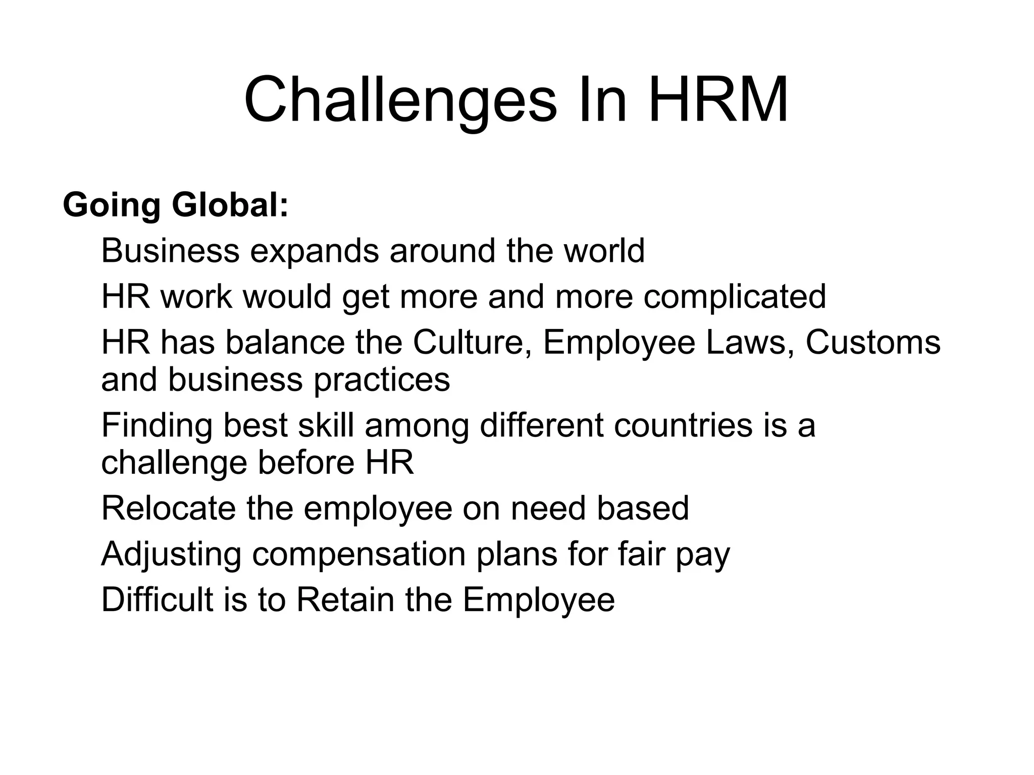 HR faces many challenges as business expands globally including balancing different cultures, employment laws, customs, and business practices. Finding and retaining the best skilled employees across countries is difficult. Embracing new technologies also poses challenges for HR as large amounts of data must be stored and people increasingly work remotely. HR must effectively manage change, align employees with strategic goals, develop human capital, and respond to shifting market conditions.