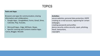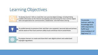 The document outlines a module focused on developing digital literacy skills including searching for information, communication, content creation, and digital safety. It emphasizes the importance of using credible sources, understanding copyright issues, and protecting personal data from online threats. The module is designed to help individuals improve their digital competencies to enhance the quality of life and safety for those they care for.