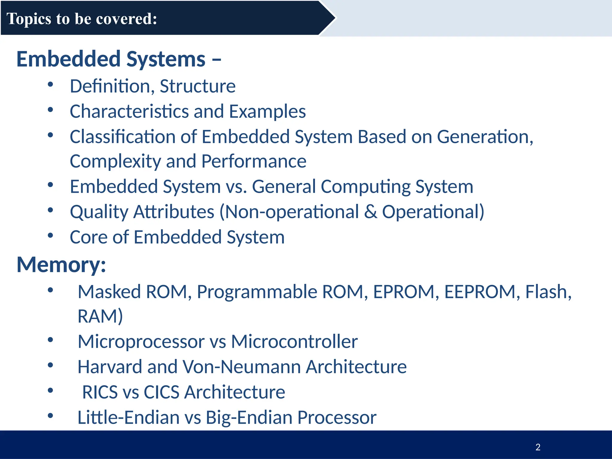 The document discusses embedded systems, covering their definition, characteristics, and various classifications based on different criteria. It highlights core aspects such as real-time operation, harsh environment adaptability, power management, and the essential quality attributes, including reliability and security. The content underscores the unique functionalities and limitations of embedded systems compared to general computing systems.