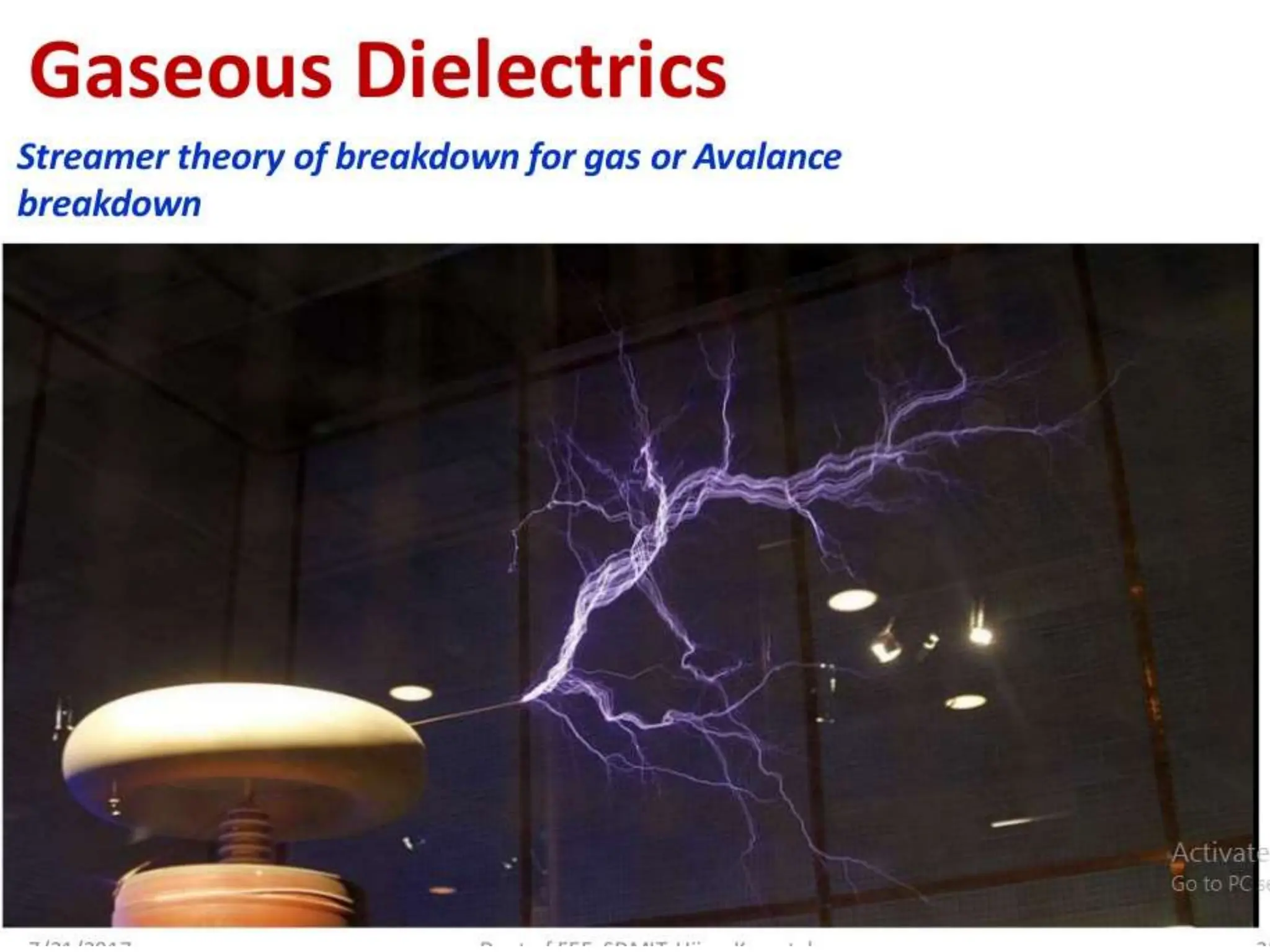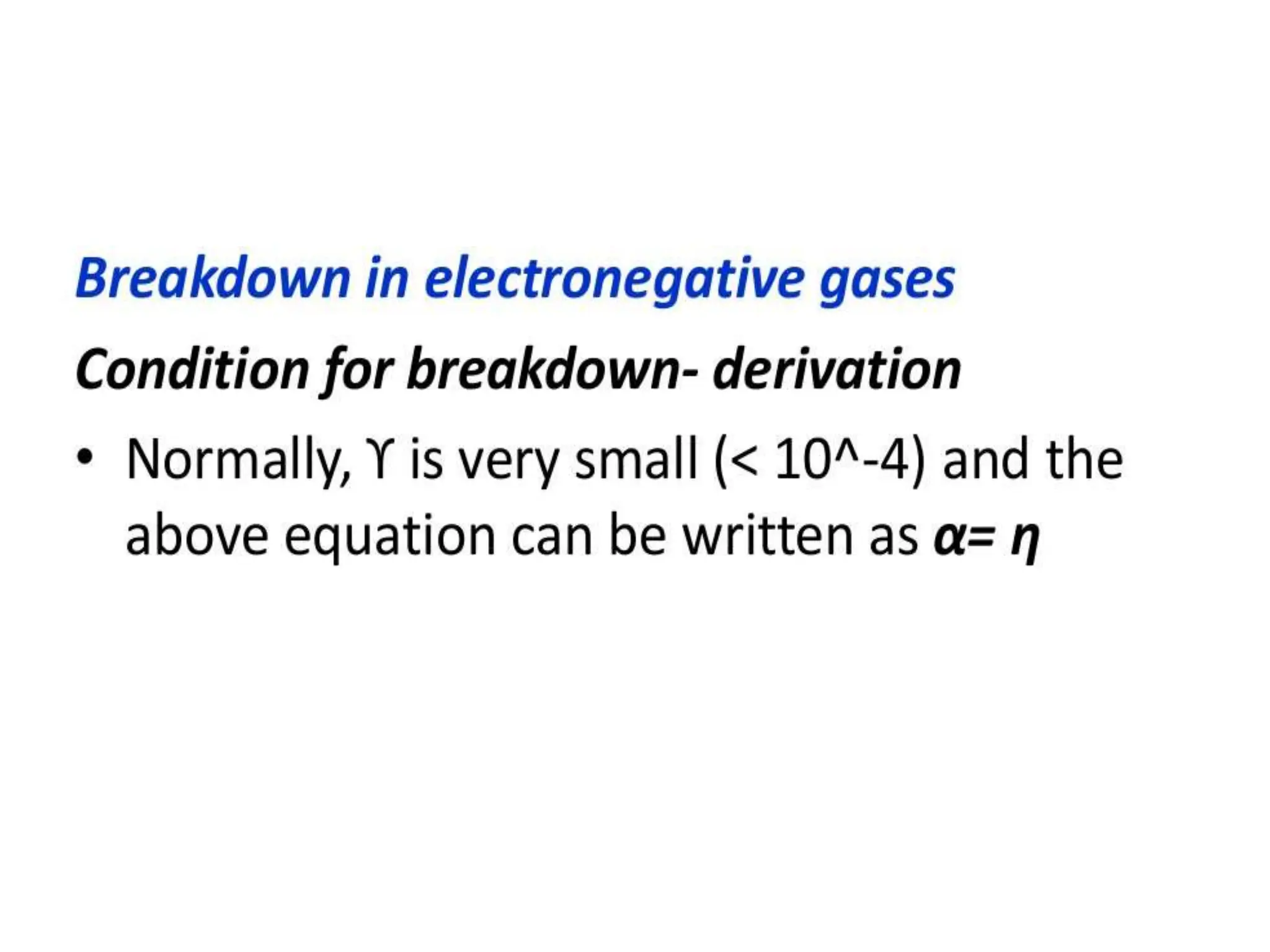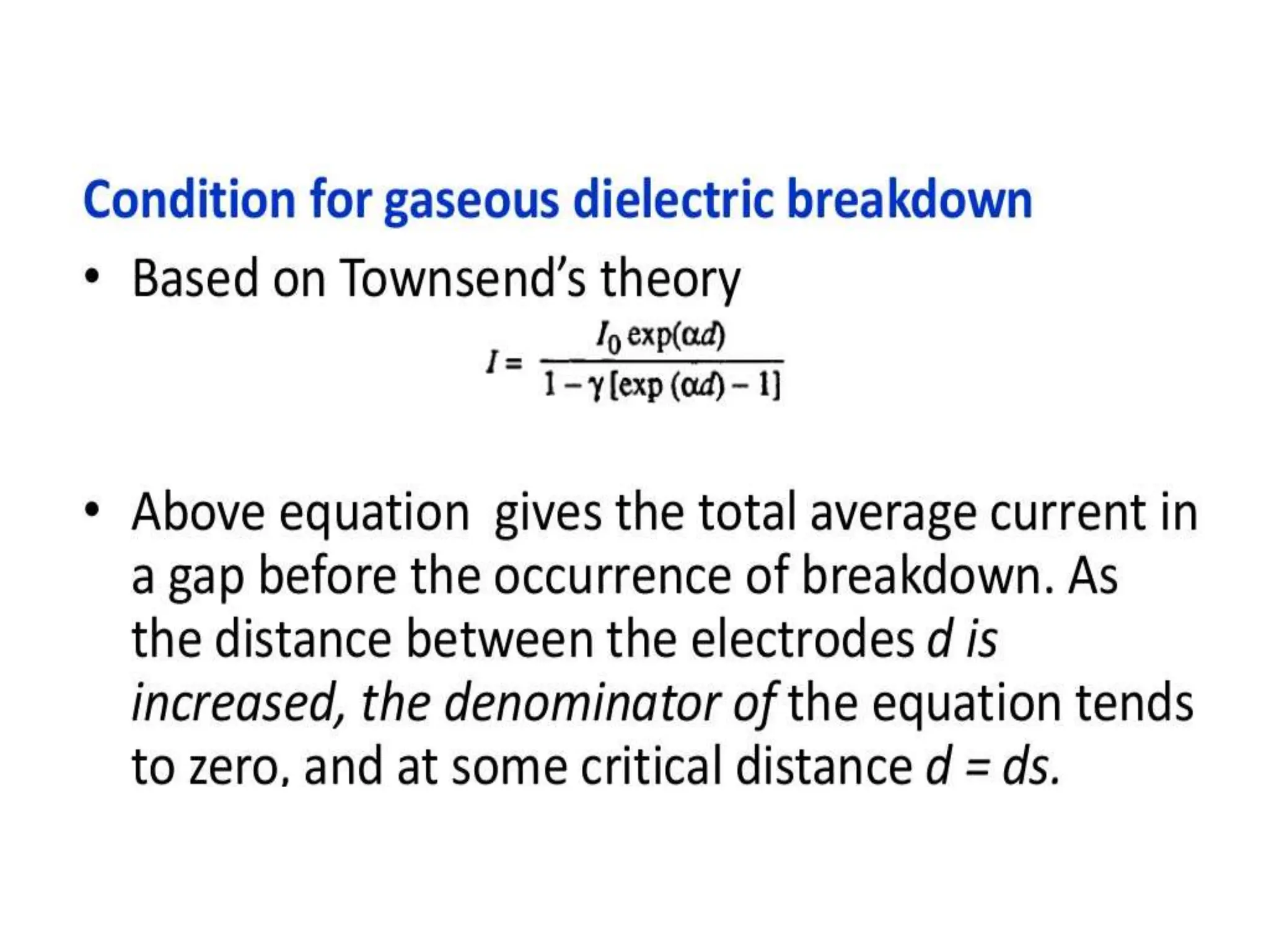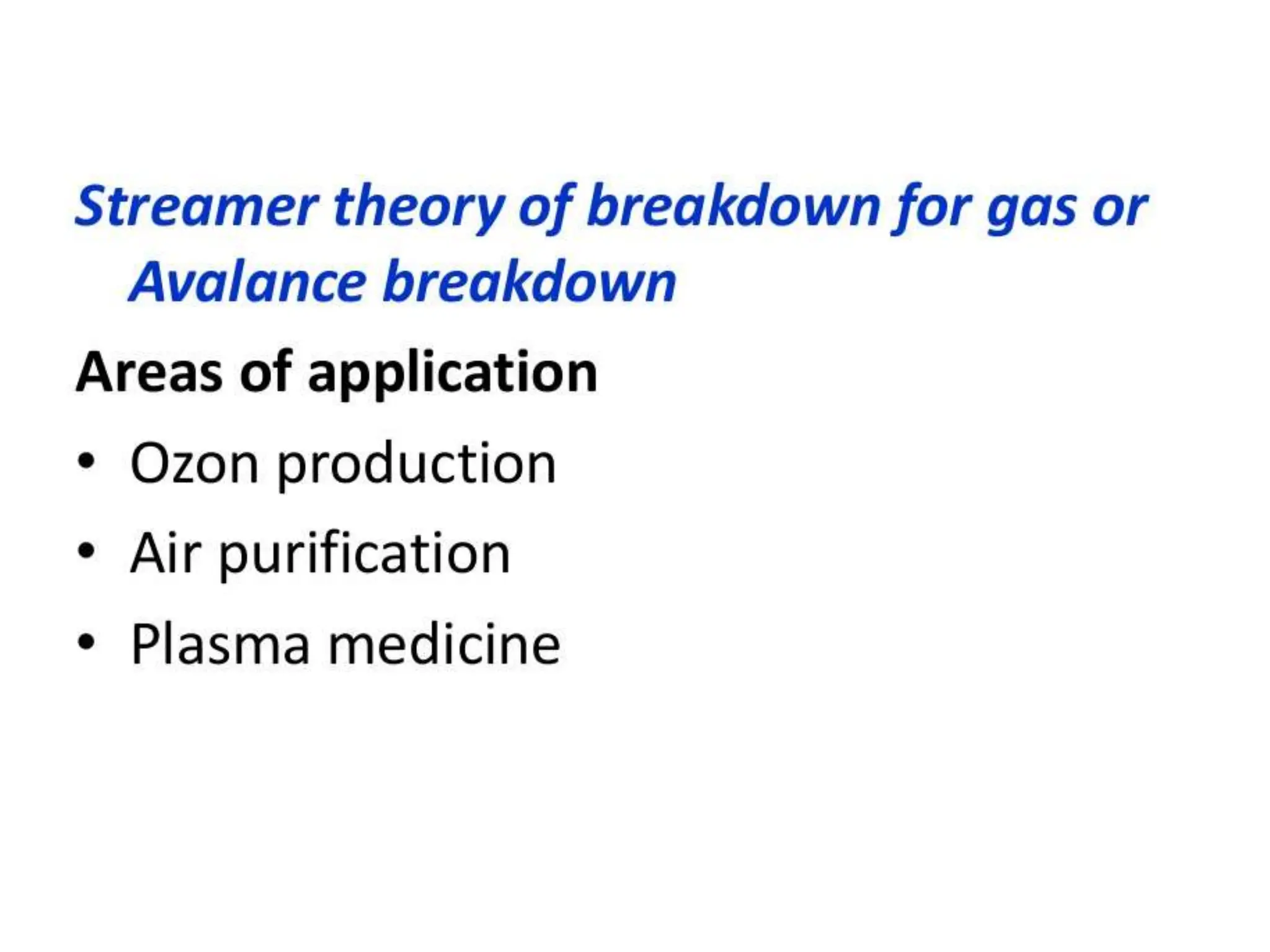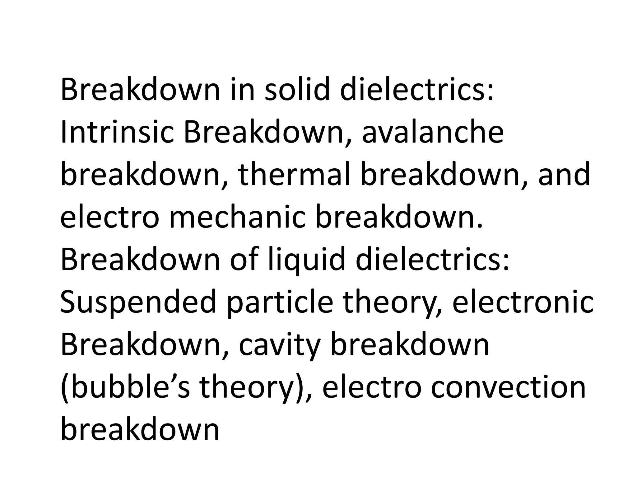 The document summarizes key topics related to breakdown in dielectric materials. It discusses intrinsic breakdown, avalanche breakdown, thermal breakdown, and electro-mechanical breakdown in solid dielectrics. It also covers suspended particle theory, electronic breakdown, cavity breakdown theory, and electroconvection breakdown in liquid dielectrics. Finally, it examines ionization processes including collisional ionization, Townsend's theory of gas breakdown, and streamer theory of non-uniform field breakdown in gases.