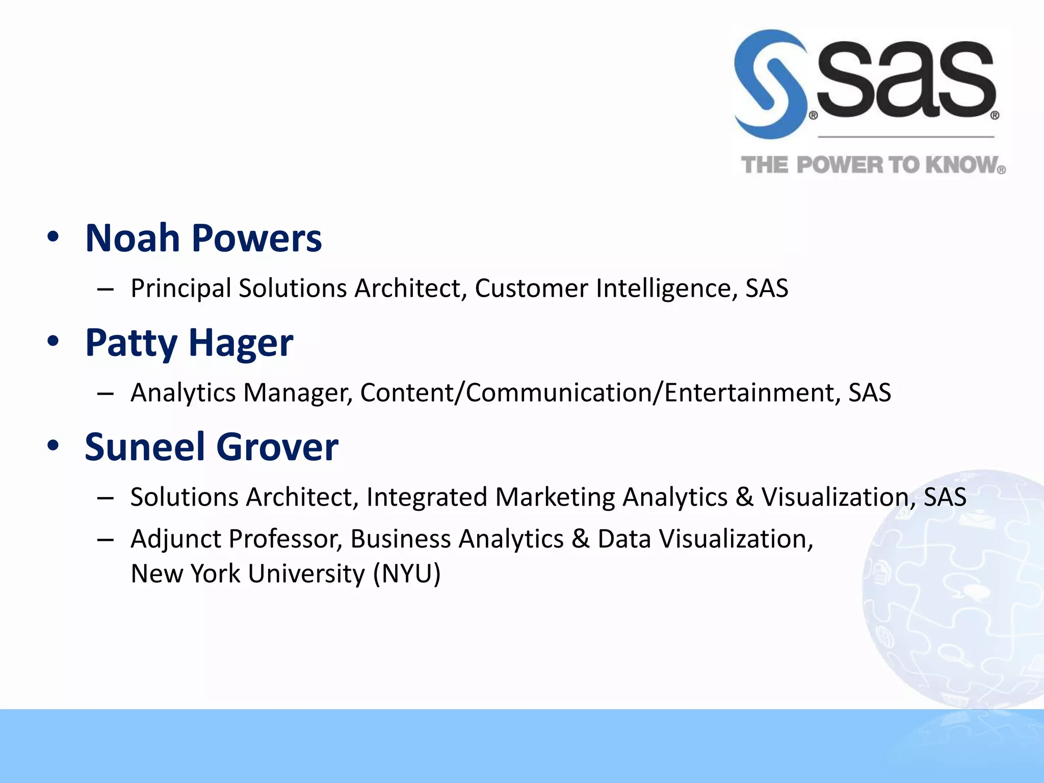 This document discusses real-time analytics and attribution. It introduces Noah Powers, Patty Hager, and Suneel Grover who are experts in customer intelligence, analytics, and visualization. It then discusses modules on information management, analytics challenges, and the predictive analytics lifecycle. Finally, it discusses segmentation, customer profitability and lifetime value, and the value of understanding customer profitability.