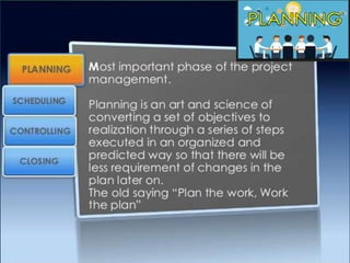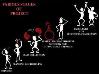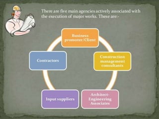 The document outlines the history and phases of construction management, detailing significant milestones in Indian infrastructure from the British period to post-independence. It defines project management as the application of knowledge and skills to meet stakeholder needs, emphasizing the importance of planning and various stakeholders involved in projects. The document also highlights project management certification and the high demand for project management professionals.