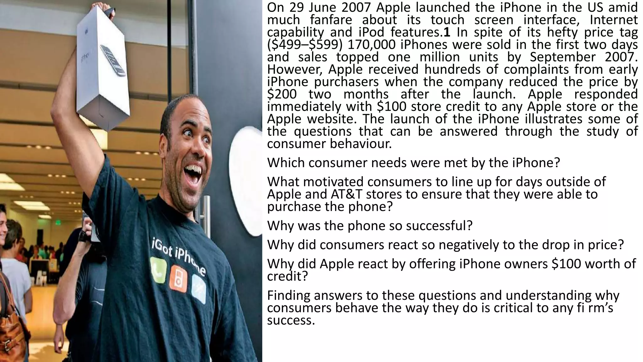 The document summarizes the launch and success of the original iPhone in 2007. It discusses how 170,000 iPhones were sold in the first two days despite its high price tag, and over 1 million were sold by September. However, Apple received complaints when they lowered the price by $200 two months later. Apple addressed this by offering $100 in store credit. The document poses questions about what motivated consumers to line up and why the phone was so successful, in order to understand consumer behavior.