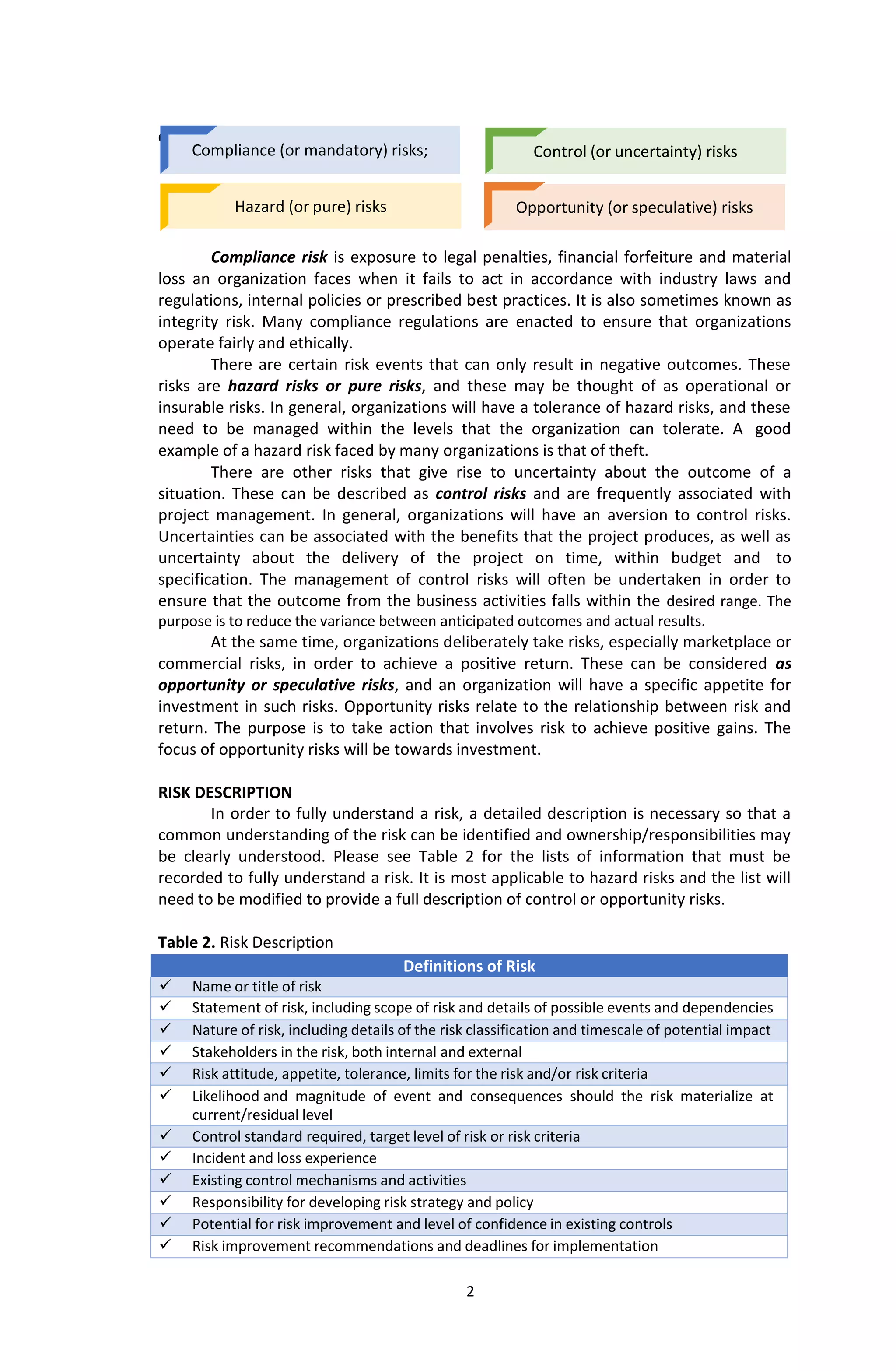 This document provides an introduction to risk management. It begins by defining risk and different approaches to defining risk. It then discusses the four main types of risks: compliance, hazard, control, and opportunity risks. It also covers risk classification systems and how to describe risks. Finally, it discusses the origins of risk management and its importance for managing organizations and changes in the marketplace.