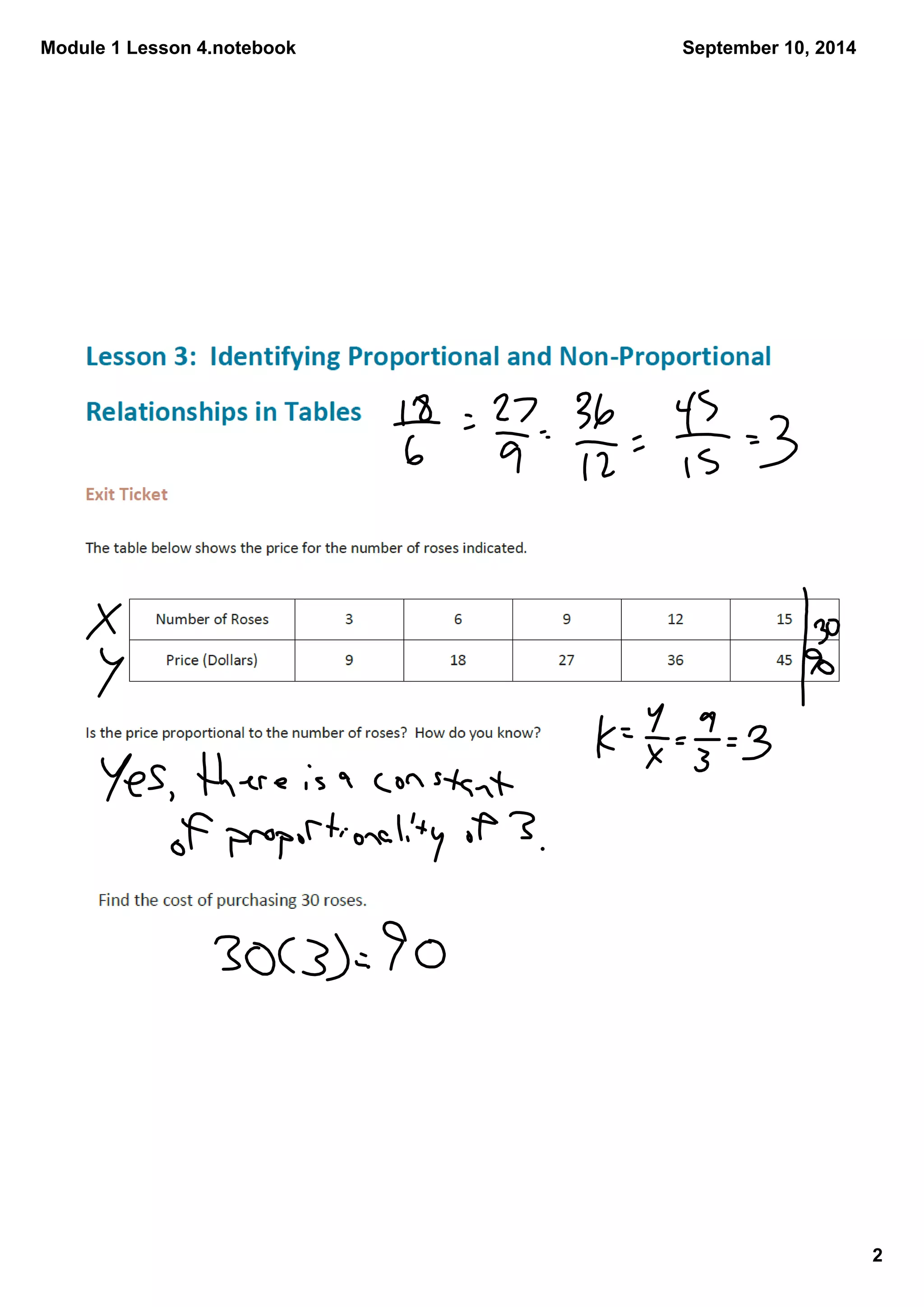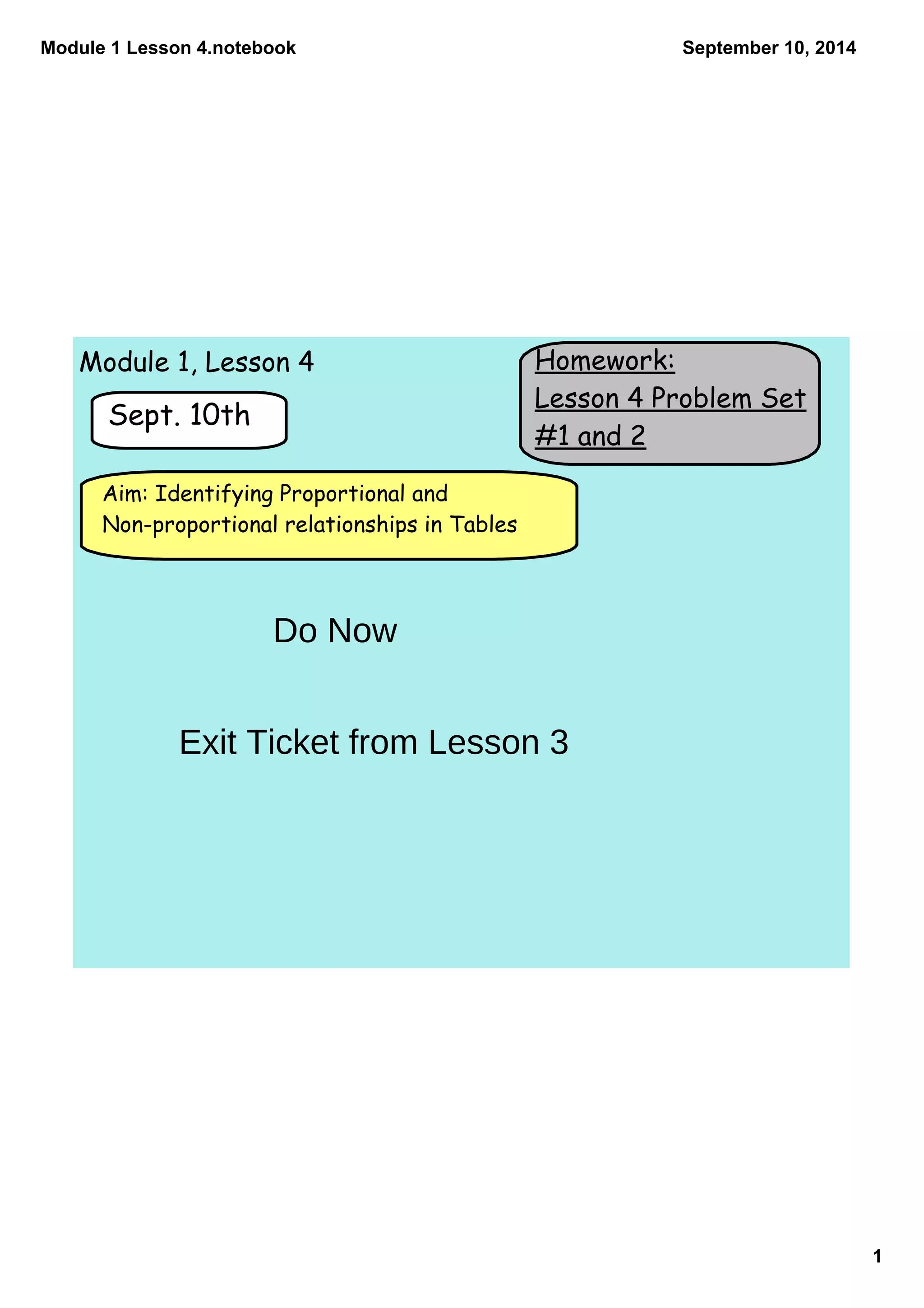 This document outlines the homework for a math lesson on identifying proportional and non-proportional relationships in tables. The homework includes creating tables to show the distances run by two teams - Team A runs at a constant rate while Team B's rate changes over time. Students are tasked with determining which relationships are proportional, which team would win races of different lengths, and using the tables to answer additional questions about the scenario.