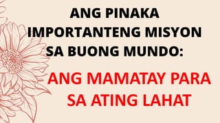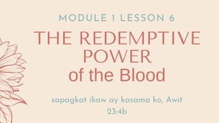 Ang dokumento ay naglalaman ng mga talumpati tungkol sa kapangyarihan ng dugo ni Jesus bilang pantubos sa ating mga kasalanan. Ito ay nagtatampok ng mga talata mula sa Bibliya na naglalarawan kung paano ang dugo ni Cristo ay nagbibigay ng kapatawaran at pagsasauli sa tamang relasyon sa Diyos. Ipinapakita rin nito ang kahalagahan ng katuwiran at kabanalan na nakamit sa pamamagitan ni Jesus.