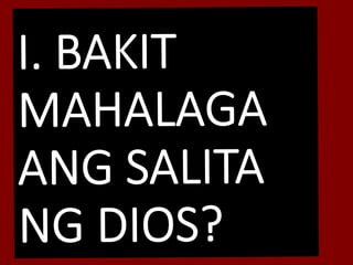 Ang dokumento ay naglalaman ng mga talata mula sa Biblia na tumatalakay sa espiritwal na kahalagahan ng salita ng Diyos bilang pagkain ng kaluluwa, na nagpapalago at nagtataguyod sa pananampalataya. Binibigyang-diin nito ang awtoridad ng Diyos at ang papel ng Kanyang salita sa paglikha, gabay, at pagtulong sa mga tao na makilala si Jesus at makamit ang kaligtasan. Tinuturo rin nito ang halaga ng pag-aaral at pagsunod sa mga utos ng Diyos upang makaranas ng pagpapala at karunungan sa buhay.