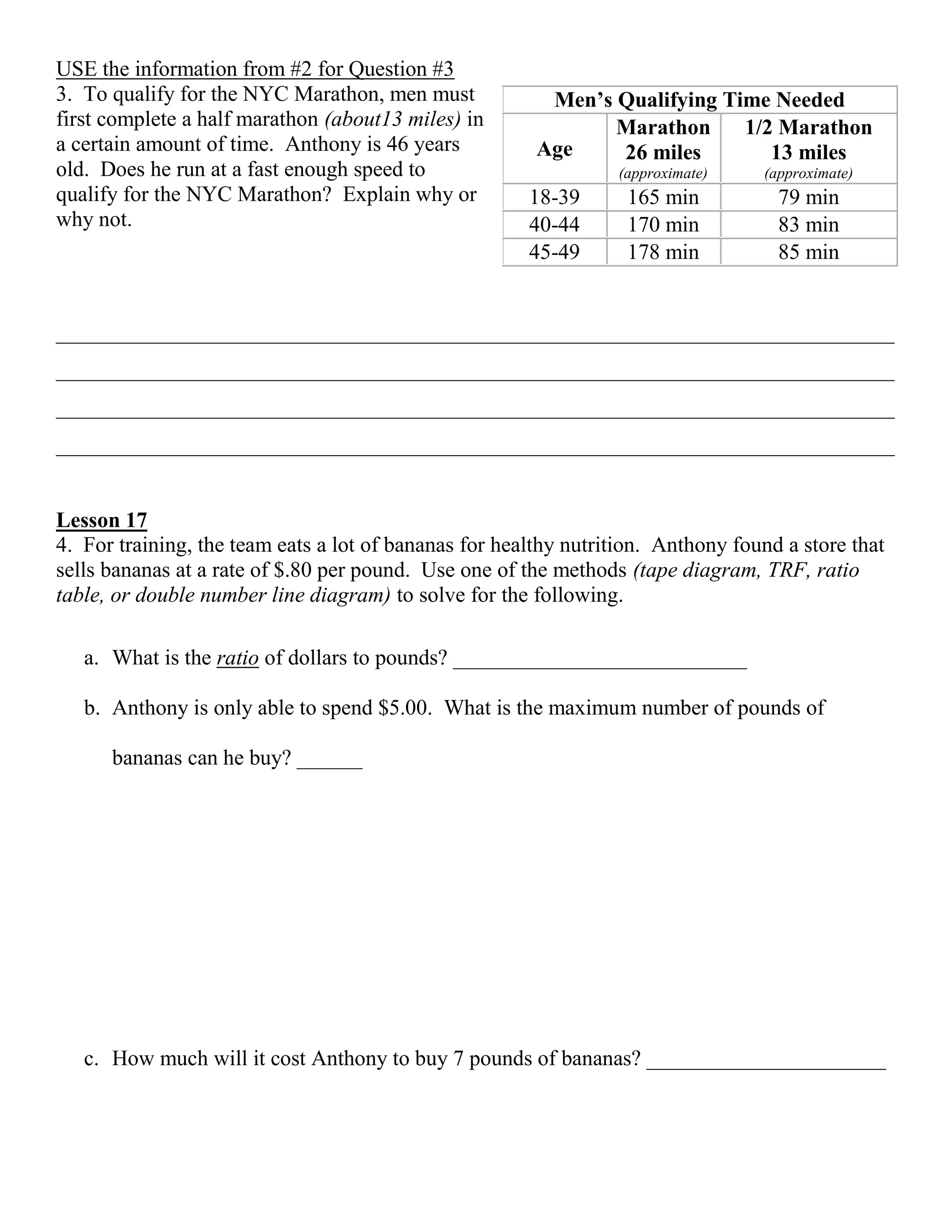 This document contains a review sheet for math lessons 16-23 focusing on concepts like unit rates, ratios, conversions, and rates of speed for runners. It includes word problems about runners' distances, times, and speeds. Questions ask students to calculate unit rates, determine if a runner qualifies for a marathon based on age and time, convert between units like pounds and dollars, and compare the rates of different runners.