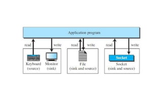 • A socketbehave like a terminal or a file, but it is not a physical entity