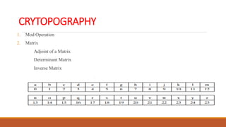 The document discusses various cryptographic techniques including: