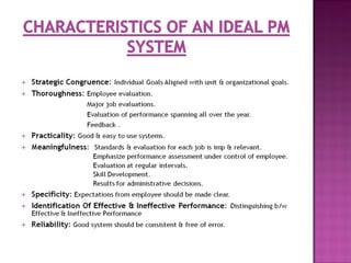 Performance management is a continuous process that aligns employee performance with organizational goals. It involves setting goals, providing feedback, and developing employees. Performance management focuses on the future, while performance appraisal focuses on past performance. Strategic planning defines an organization's goals and strategies. Performance management links individual employee roles and goals to the organization's strategic plan through job descriptions and individual performance criteria. This ensures employees' work contributes to achieving strategic objectives.