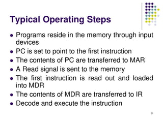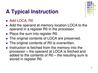 2) Arithmetic and logic operations on data (ADD, SUB, MUL, DIV, AND, OR,