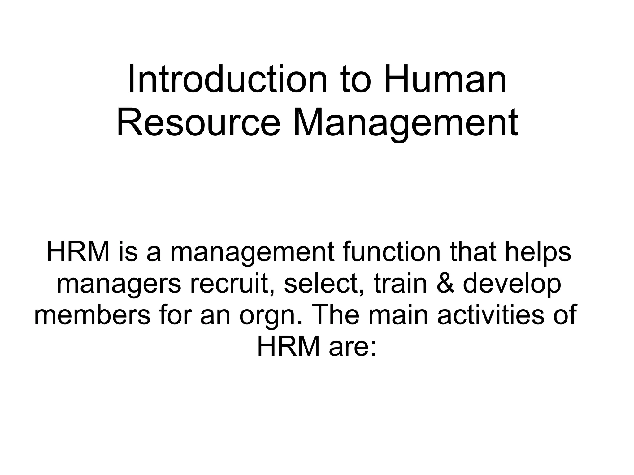 The document provides an introduction to human resource management (HRM). It discusses the key activities of HRM including human resource planning, recruitment, selection, training and development, performance appraisal, compensation, and employee welfare. It also covers the importance of HRM for organizations, individuals, and society. Different models of HRM and its objectives and functions within an organization are described. The processes of job analysis, recruitment, and selection are also summarized.