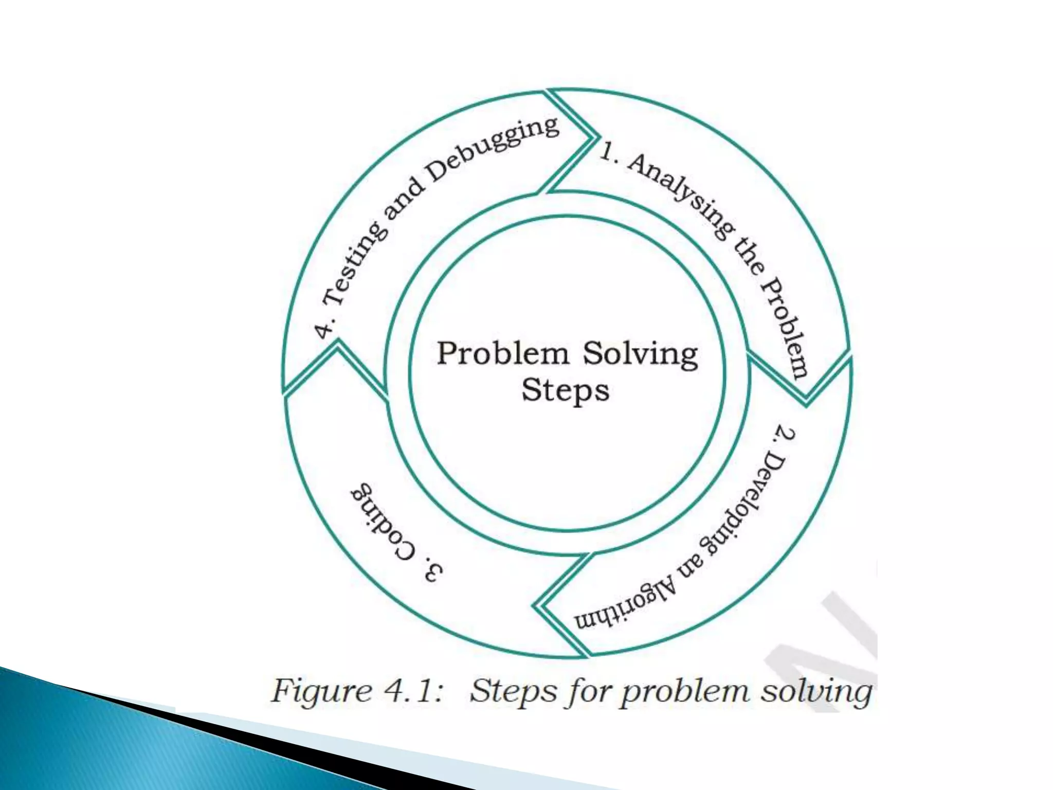 The document discusses problem solving using computers, describing how problem solving involves defining the problem, developing an algorithm to solve it, and implementing that algorithm as a computer program. It outlines the key steps in problem solving as analyzing the problem, developing an algorithm using tools like flowcharts and pseudocode, coding the algorithm, and testing and debugging the program. Proper problem analysis and algorithm development are emphasized as critical to producing the correct output through a computer program.