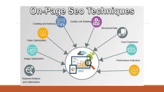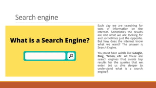 The document provides an overview of search engine optimization (SEO), including defining SEO, explaining the importance of SEO, describing the different types of SEO (on-page, off-page, technical), and summarizing some major updates to Google's algorithms. SEO involves optimizing websites and content to rank higher in search engine results and get more visitors from search engines by focusing on keywords, links, site speed and structure. The goal of SEO is to help websites be more discoverable online and improve organic traffic and sales.