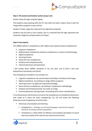 This document outlines a CLIL unit plan for a 4th grade Art class on corporate design. The unit will teach students about logos and how graphic designers represent a company's image through visual elements like shapes, colors, and typography. Students will learn 20 related vocabulary words and apply competencies like linguistic skills, digital skills, learning skills, and cultural awareness. They will create their own logo representing given adjectives, easiest by using image editing software on laptops. The unit connects to ICT and entrepreneurship subjects and aims to develop students' creativity, communication, knowledge application, analysis, collaboration, and computer drawing skills.