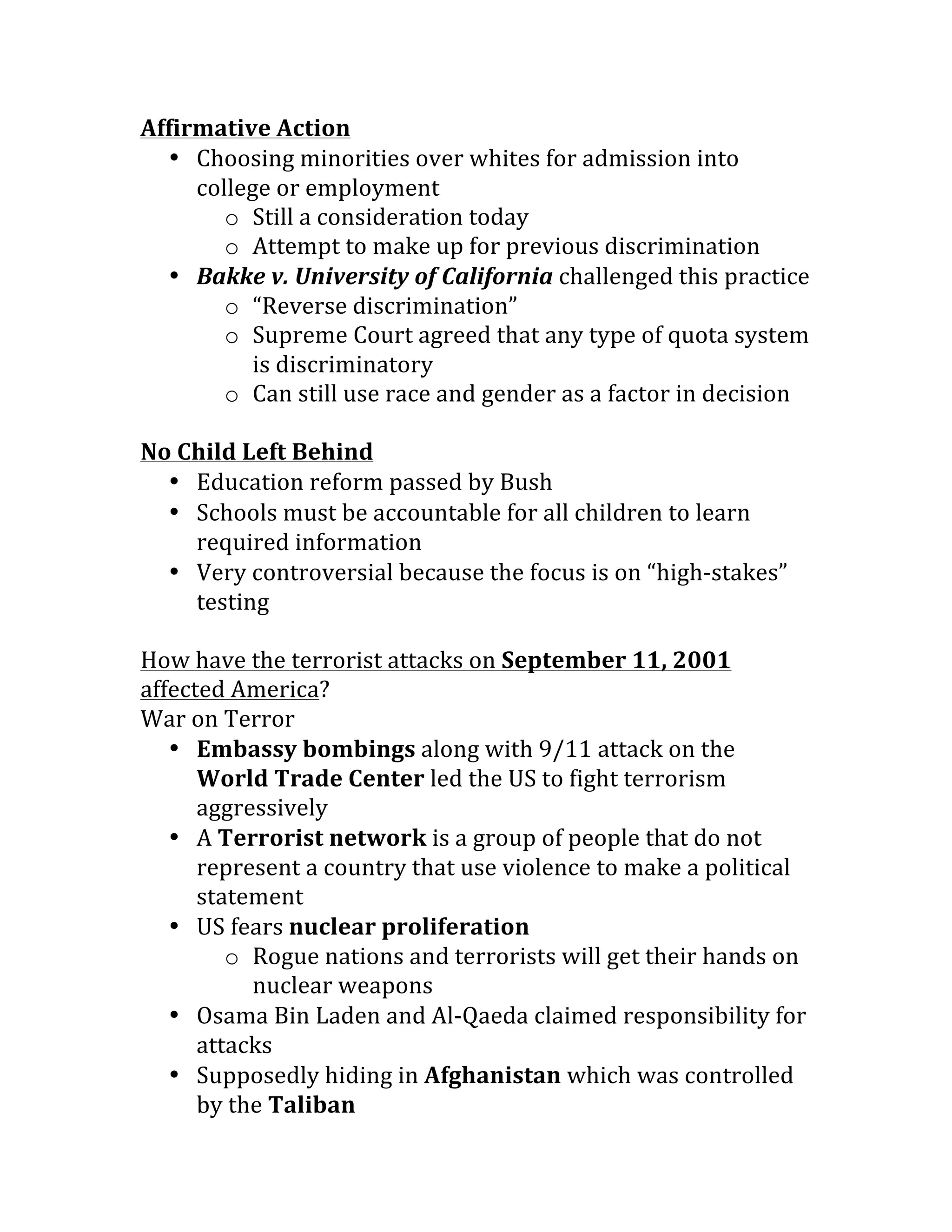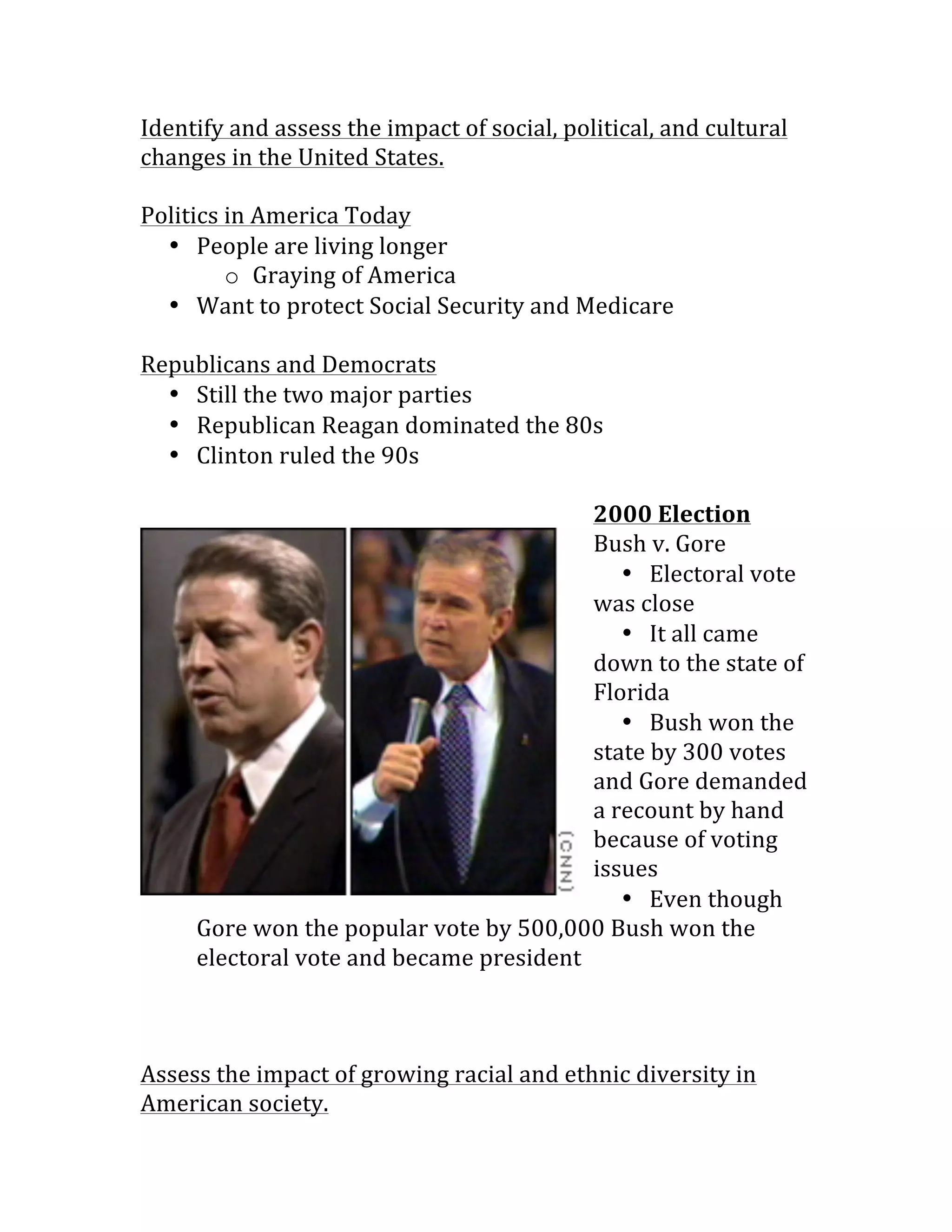 The document summarizes several key social, political, and cultural changes in the United States over recent decades. It discusses the aging of the American population and debates over Social Security/Medicare. It outlines the continued dominance of Republicans and Democrats as the two major parties. It also summarizes the controversial 2000 Bush v. Gore election that came down to a few hundred votes in Florida. The document next assess the impact of growing racial/ethnic diversity through topics like affirmative action and the No Child Left Behind Act. Finally, it outlines the major effects of the 9/11 terrorist attacks, including the War on Terror in Afghanistan and Iraq as well as increased security measures domestically through acts like the Patriot Act.
