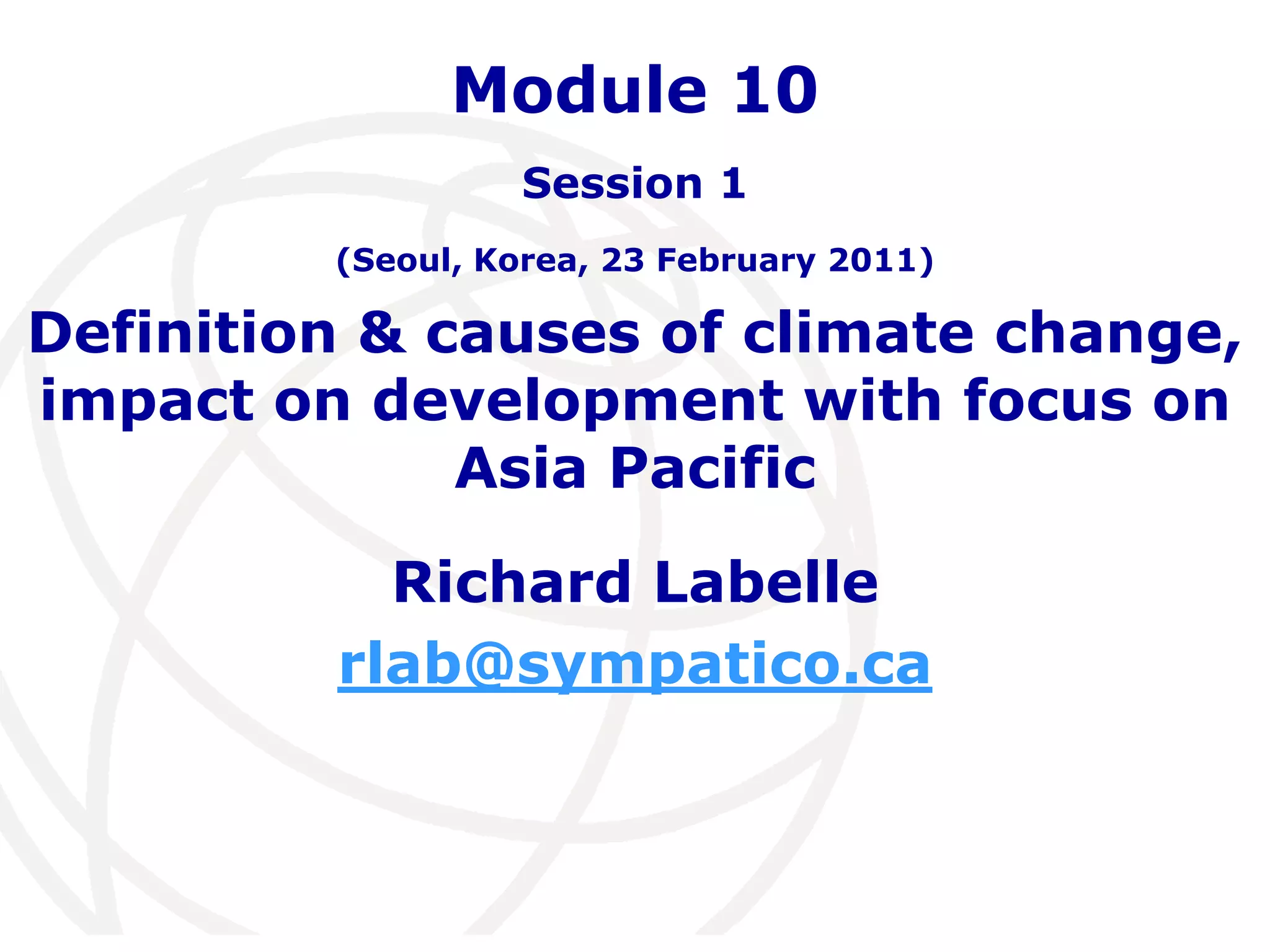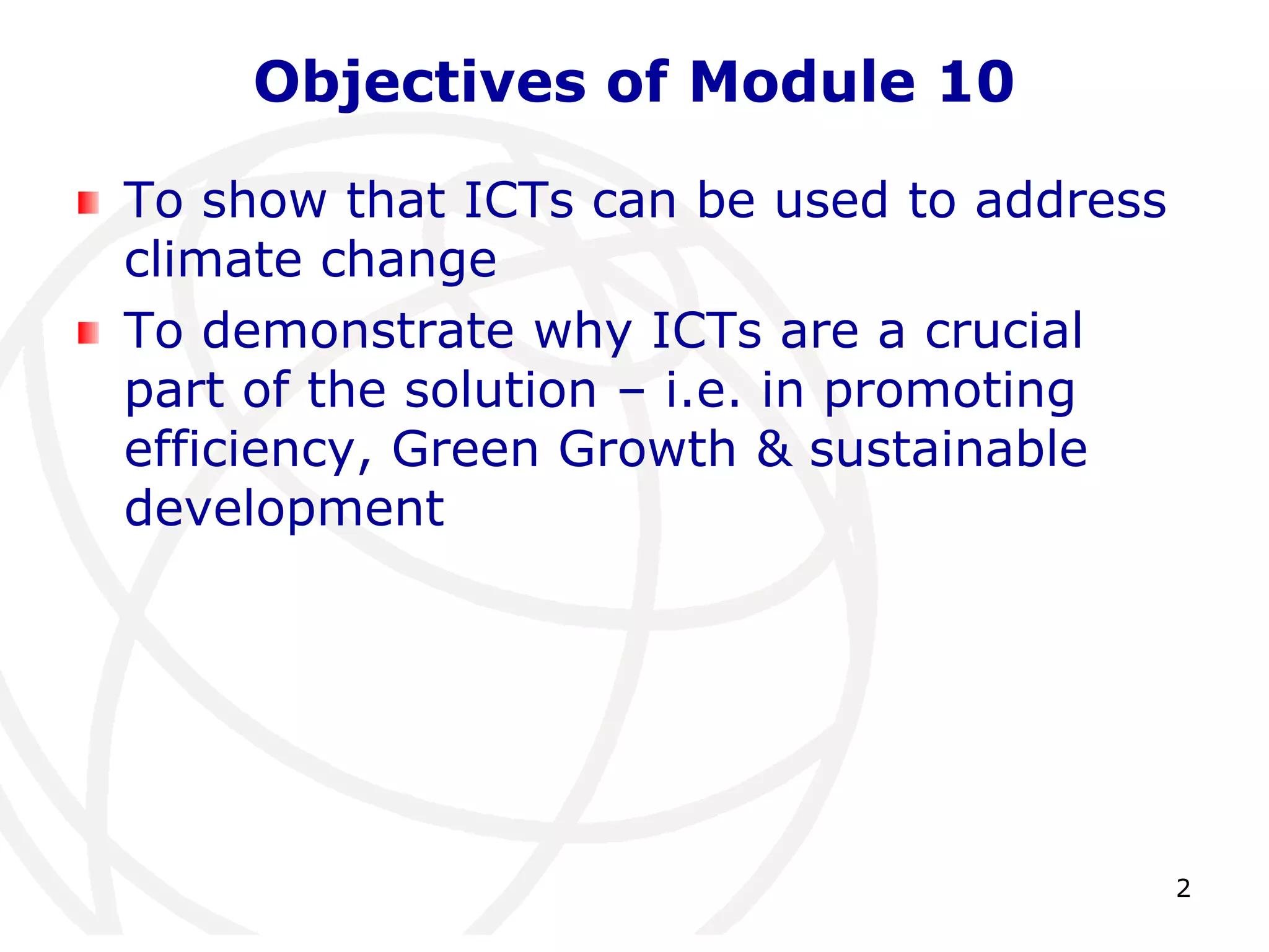 This document discusses climate change and its causes, impacts, and potential solutions. It provides evidence that climate change is occurring due to human greenhouse gas emissions, outlines the various impacts expected across different regions including Asia Pacific and small island states, and explores how information and communication technologies and a transition to renewable energy coupled with energy efficiency can help address climate change. The document aims to demonstrate that ICTs will be crucial to promoting green growth and sustainable development.
