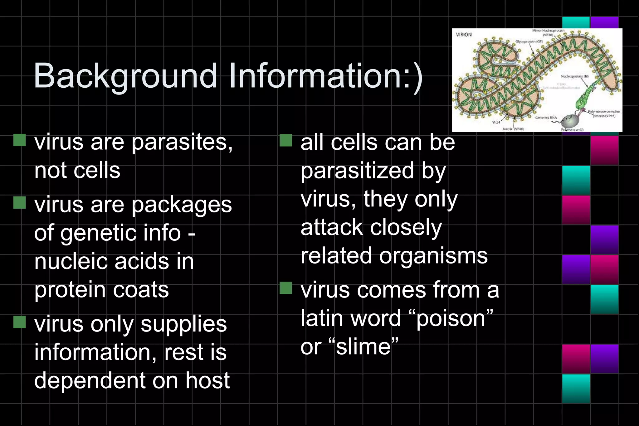 This document provides information on viruses including their structure, classification, life cycles, and examples of common viral diseases. It defines key terms like capsids, genomes, and envelopes. It describes the four main types of viral structures: helical, icosahedral, enveloped, and complex. It covers taxonomy and the bases for viral classification such as host range, size, and antigenic properties. Examples are given of major viral families that infect animals like Herpesviruses, Hepadnaviruses, Retroviruses, Arenaviruses, Flaviviruses, and more.