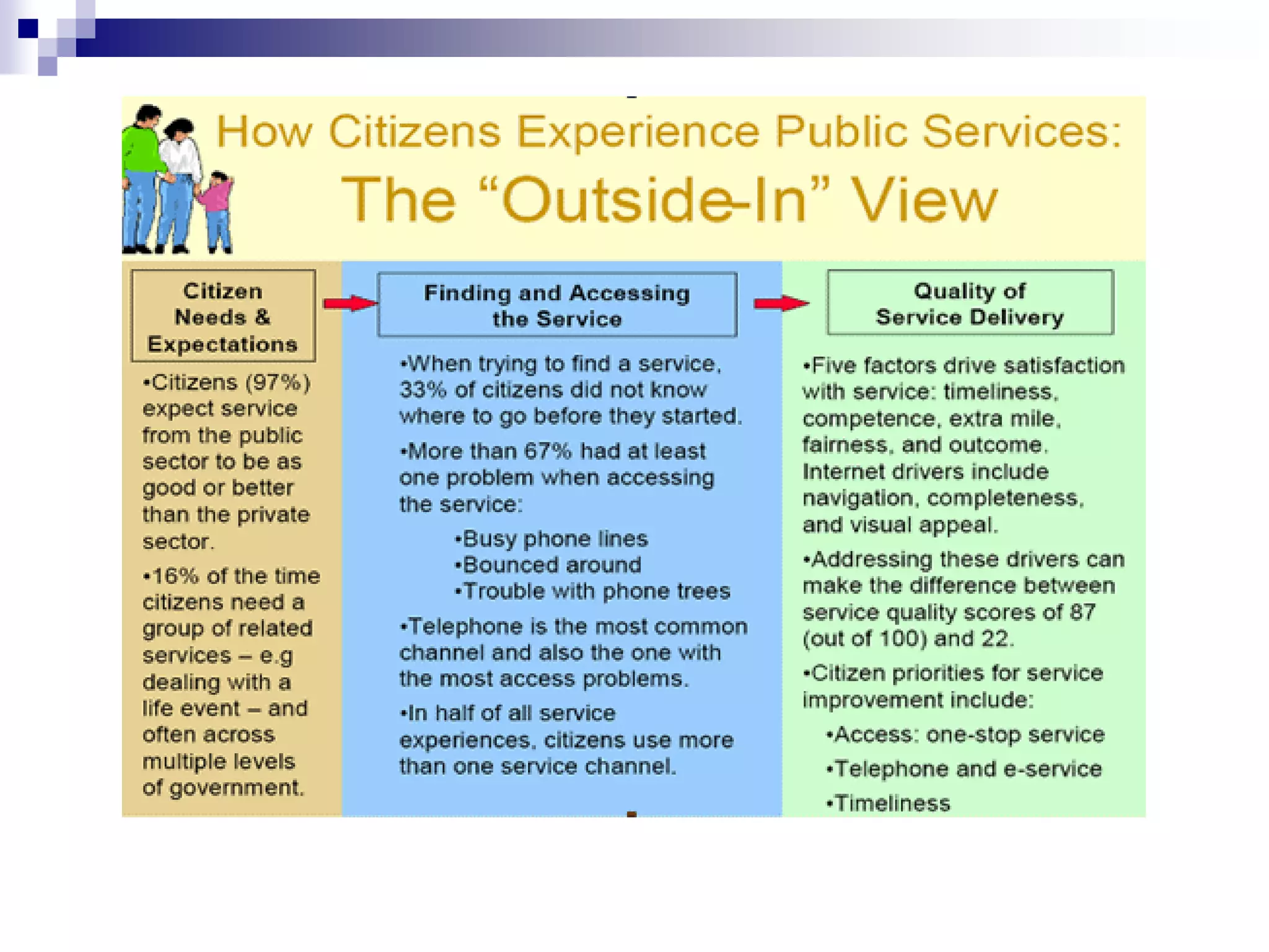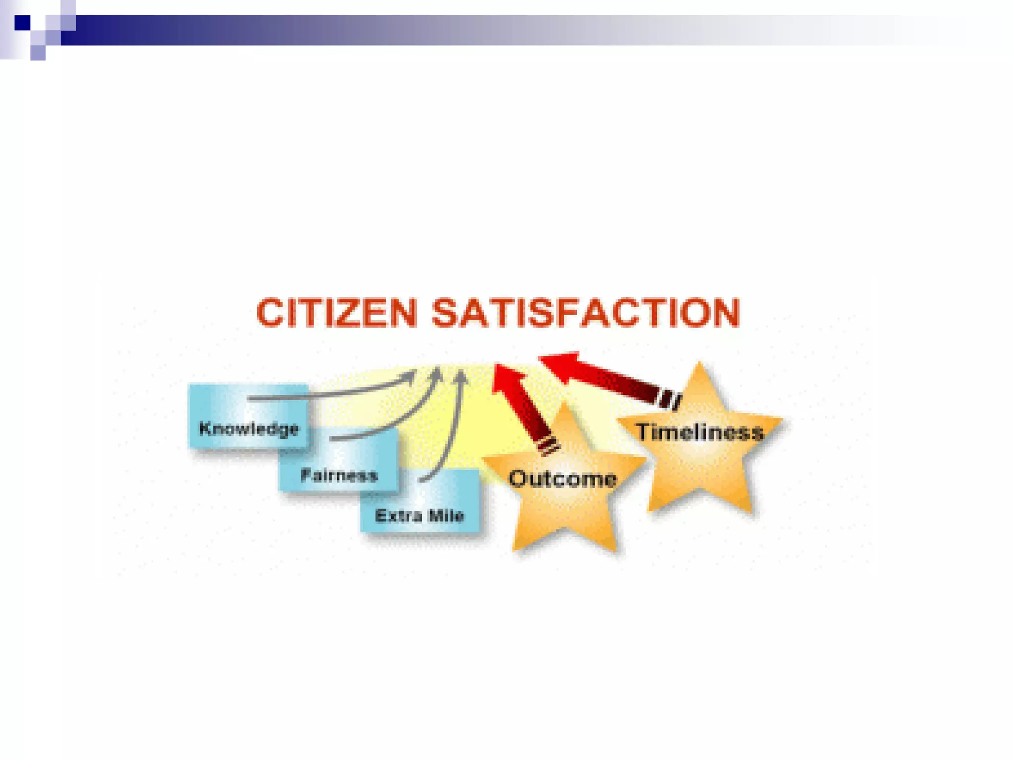 1) The document discusses citizen engagement and the political-bureaucratic divide in government. It covers topics like client satisfaction, citizen-centered approaches, and measuring user satisfaction to improve government services.