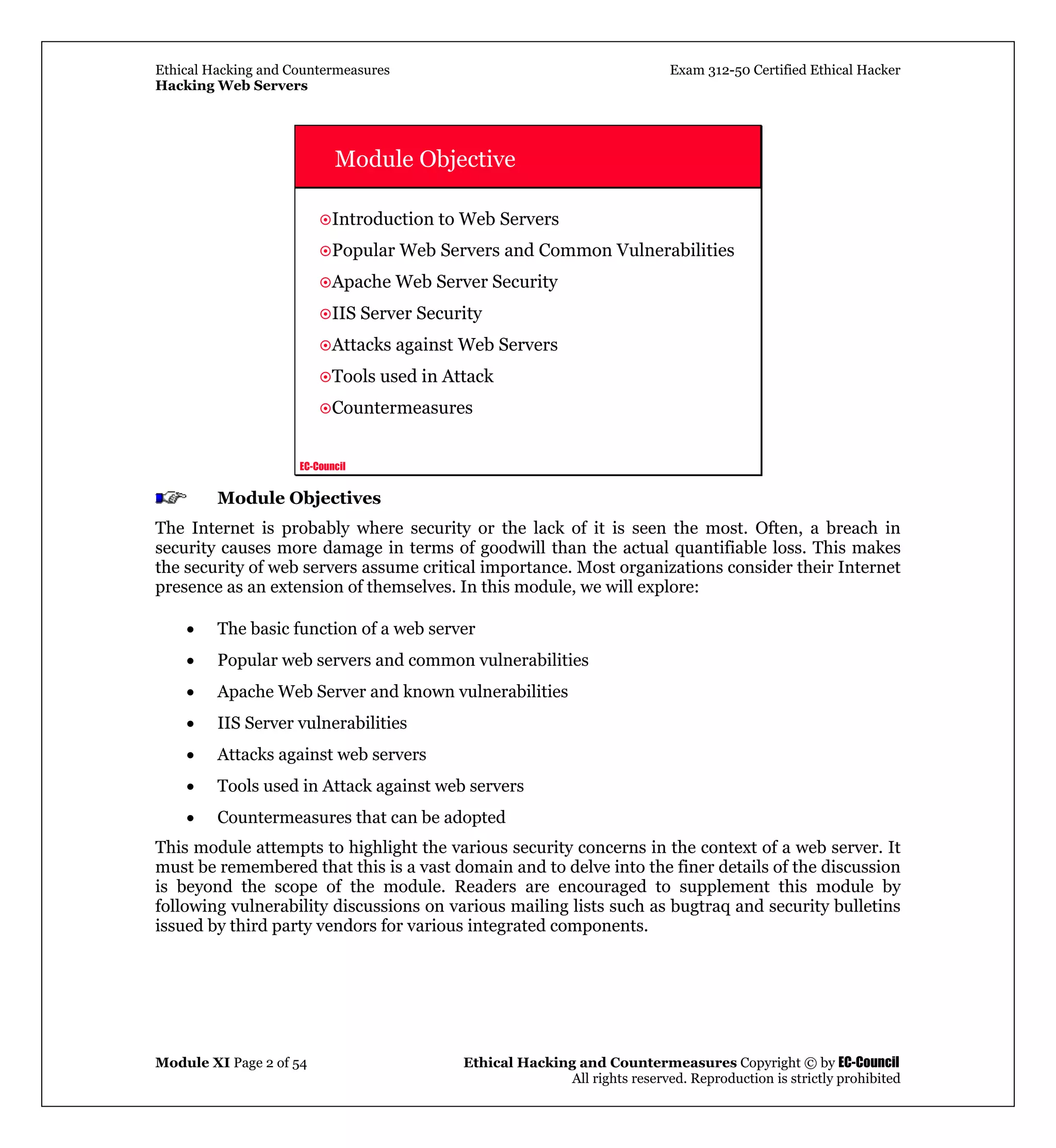 This document covers ethical hacking and countermeasures related to web servers, highlighting the importance of web server security due to potential vulnerabilities and attacks. It details how web servers function, popular server types such as Apache and IIS, common security threats, and specific vulnerabilities that can be exploited. Additionally, it emphasizes the need for proper configuration and security measures to protect against potential breaches.