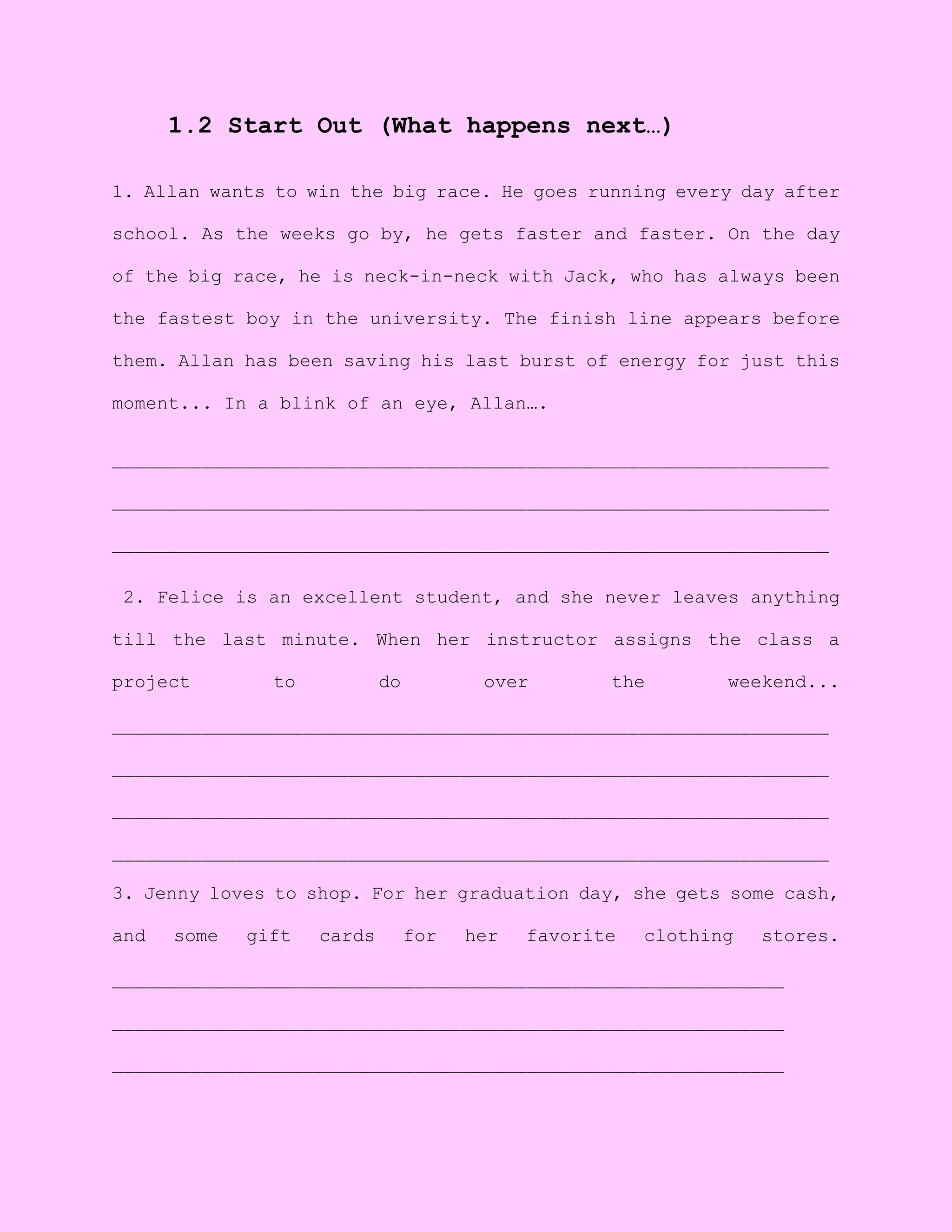 The document outlines three distinct narratives: Allan, who trains hard to win a race against his rival Jack; Felice, a diligent student who plans ahead for an upcoming project; and Jenny, who receives cash and gift cards for her graduation to indulge in shopping. Additionally, it poses questions about the future characteristics of two individuals, Azeeiah and Ameera, inviting predictions about their physical and emotional changes over a decade. Overall, it highlights themes of ambition, preparation, and personal growth.