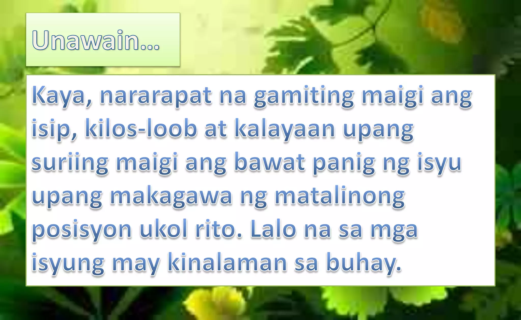 Ang dokumento ay naglalarawan ng mahahalagang isyu sa edukasyon sa pagpapakatao, kabilang ang kahalagahan ng buhay at mga pananaw ukol sa isyu ng aborsiyon. Binibigyang-diin ng mga tinalakay na posisyon ang respeto sa buhay, mga responsibilidad ng mga magulang, at ang pag-unawa sa kalusugan ng isip. Ipinapasok din ang mga pananaw sa euthanasia at kung paanong ang buhay ay sagrado batay sa mga relihiyon.