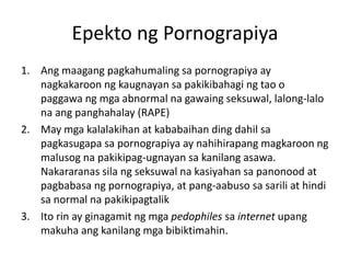 Ang pornograpiya ay mga mahahalay na paglalarawan na naglalayong pukawin ang seksuwal na pagnanasa, subalit nagdudulot ito ng mga masamang epekto katulad ng abnormal na seksuwal na pag-uugali at pagkasugapa sa pornograpiya na nakakasira ng mga relasyon. Ang mga pang-aabuso tulad ng prostitusyon at sexual harassment ay nagiging mas masalimuot at nag-aambag sa pagbagsak ng dignidad ng tao, kung saan ang mga biktima ay nagiging kasangkapan ng mga pangangailangan at hindi na nakikilala ang kanilang halaga. Ang pangunahing layunin ng seksuwalidad ay dapat naka-ugat sa pagmamahal at pagbuo ng pamilya, ngunit ang pornograpiya at prostitusyon ay lumalabag dito sa pamamagitan ng pagbibigay-diin sa walang kabuluhang kasiyahan.