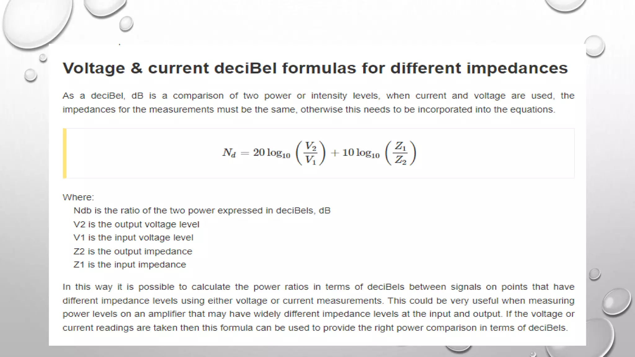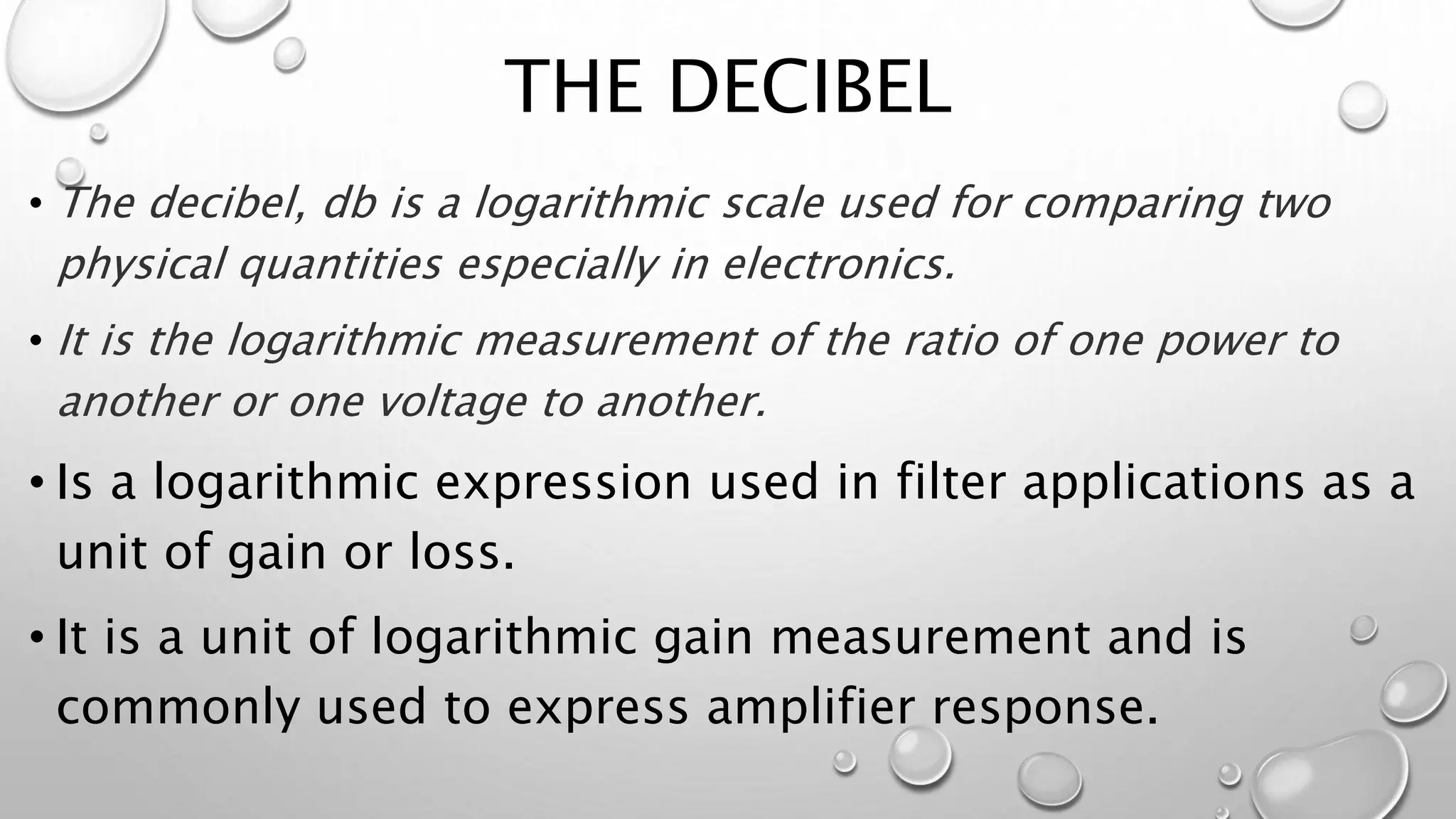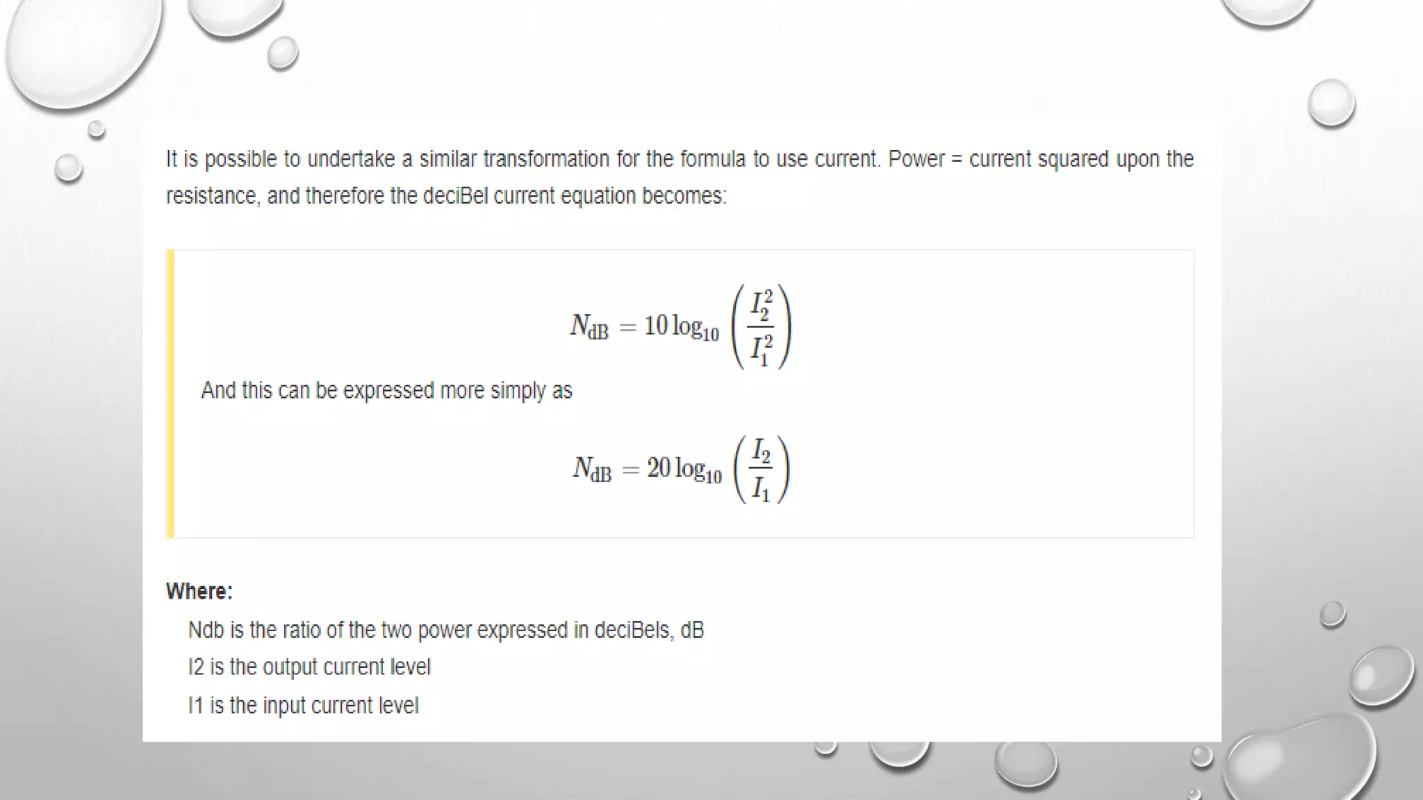 This document provides an introduction to logarithms, decibels, and their applications. It defines logarithms and decibels, and explains that decibels are used to compare power ratios and signal gains/losses in electronics. Several decibel formulas are given for power, voltage, and current comparisons. Examples are provided to demonstrate calculating power gain in decibels and determining output voltage given a known attenuation in decibels.