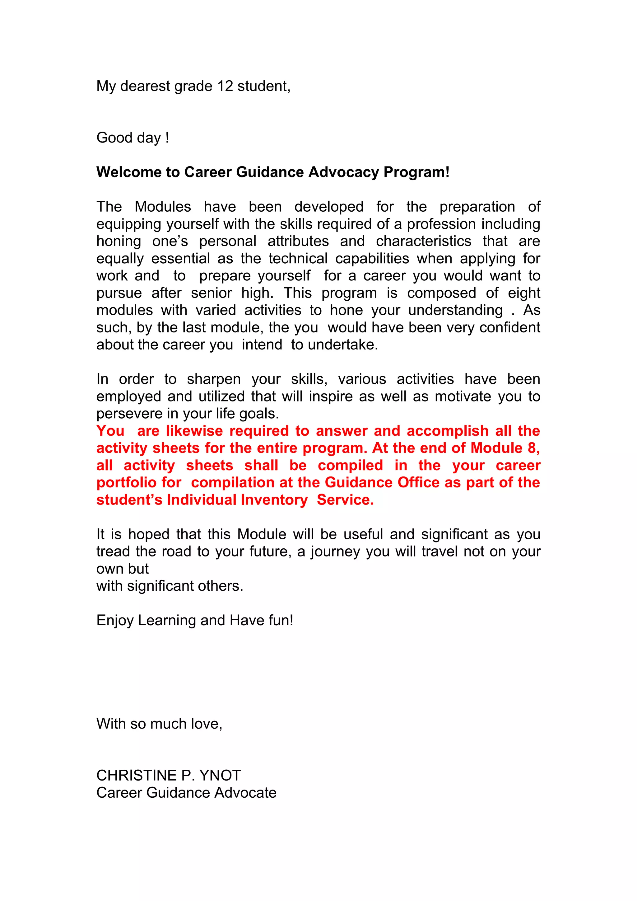 This document provides information about career guidance programs for grade 12 students in the Philippines. It discusses the National Career Assessment Examination that assesses students' aptitudes and interests in senior high school. It also outlines the various exits students can pursue after graduating from senior high school, including employment, entrepreneurship, higher education, and middle-level skills development programs. The document encourages students to carefully consider their options and utilize their talents to find success.