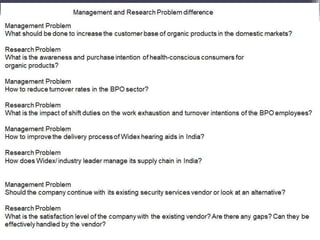 The document discusses various aspects of business research methods. It defines business research as the systematic and objective process of generating information to aid in making business decisions. Some key points include: