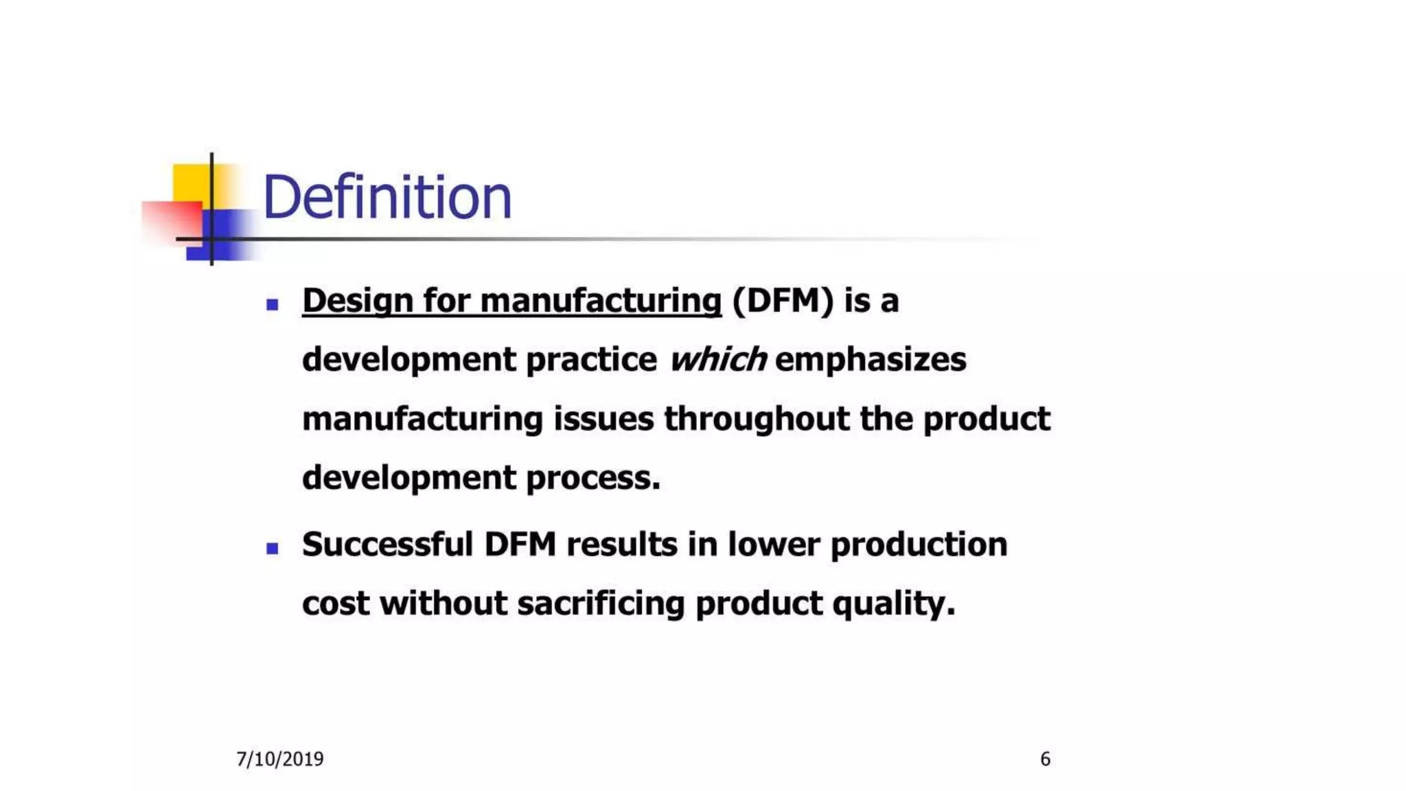 Design for manufacturing (DFM) aims to design products for ease and lower cost of manufacturing by simplifying and optimizing the design. 70% of manufacturing costs are determined by design decisions. Guidelines for DFM include reducing part count, using modular and standard components, designing parts for multiple functions and uses, selecting optimal fabrication methods, avoiding separate fasteners, minimizing assembly directions and handling, and ensuring compliance and tolerance for errors. An example is intentionally rough welding on rocket motors to reduce unnecessary finishing costs.