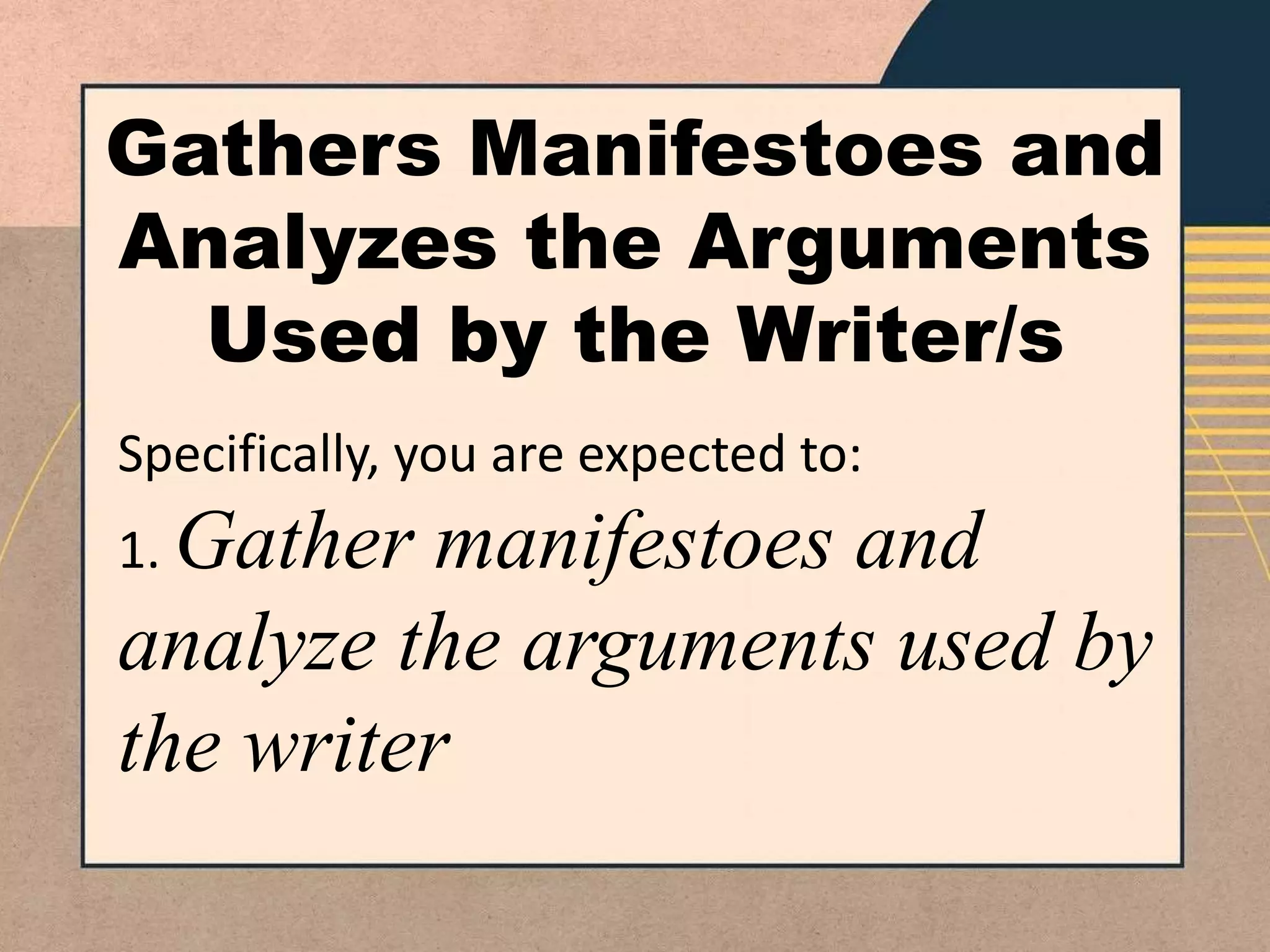 This document provides instructions and background information for a task that requires students to: 1) Gather manifestos and analyze the arguments used by their writers 2) Understand that manifestos are published declarations of views from individuals, groups, governments 3) Know that argumentative writing establishes a position using evidence to persuade, and that arguments are main ideas backed by supporting evidence.