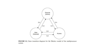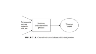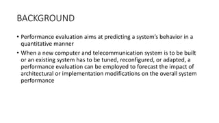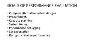 The document discusses performance evaluation of computer and telecommunication systems. Performance evaluation aims to quantitatively predict a system's behavior and is used to compare designs, plan for capacity, and debug performance issues. It involves modeling, simulation, and testing approaches of varying cost and accuracy. Key metrics include counts, times, sizes, productivity, response time, and reliability measures. Workload characterization analyzes how systems are used, while benchmarks compare performance across systems running standardized tests.