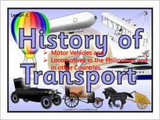 This document provides an overview of the historical development of land transportation used by humans. It describes how early humans first traveled on foot and then began using animals like donkeys, horses, and camels for transport around 4000-3000 BC. Various early modes of transportation are outlined, including carrying poles, back loads, sledges on rollers or runners, and travois. The document also lists domesticated animals from ancient times that were used for transportation, such as oxen, reindeer, dogs, donkeys, llamas, elephants, horses, camels, and yaks.