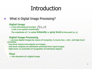 This document provides an introduction to digital image processing. It discusses what digital image processing is, the origins of the field, and sources for digital images like the electromagnetic spectrum. It also covers fundamental steps like image acquisition, representation, sampling and quantization. Key concepts discussed include pixels, pixel relationships, interpolation methods, spatial and intensity resolution, and image representation in MATLAB.