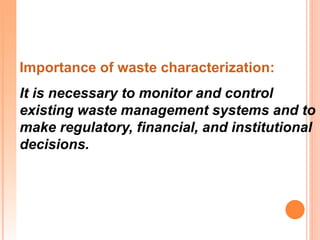 The document addresses solid waste management, detailing various sources and types of municipal solid waste (MSW), including residential, industrial, commercial, and agricultural origins. It emphasizes the significance of waste characterization for effective management decision-making, discusses waste hierarchy principles like reduce, reuse, and recycle, and covers various categories and physical and chemical properties pertinent to waste. Additionally, it identifies deficiencies in current waste management systems and highlights the need for improved waste processing and disposal methods.