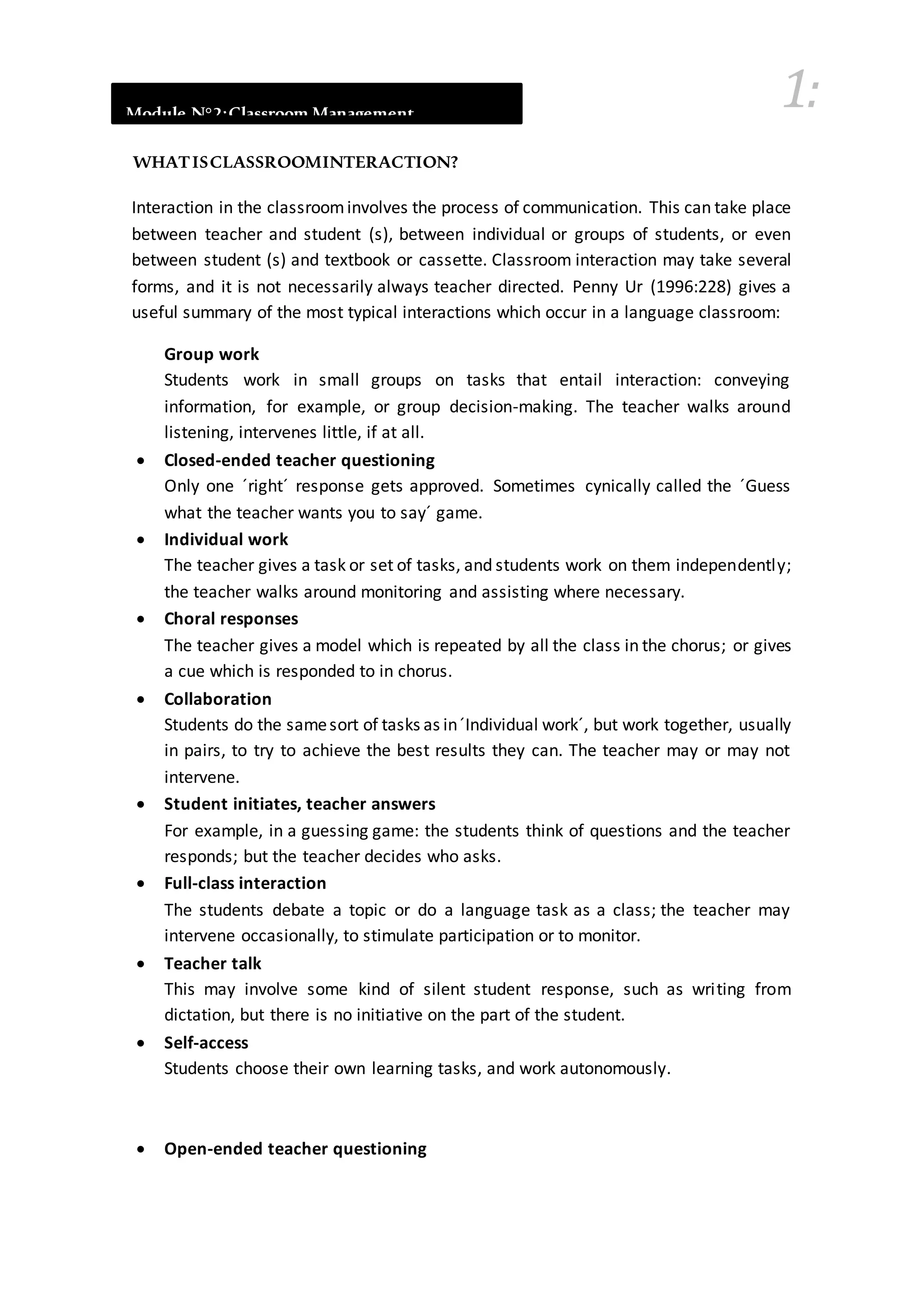 The document discusses various forms of classroom interaction and the importance of teacher talk in language acquisition. It highlights different interaction types, including group work, individual tasks, and teacher questioning, while emphasizing the balance between student-centered and teacher-centered approaches. Additionally, it addresses the role of corrective feedback and the impact of collaborative versus competitive learning structures in the classroom.