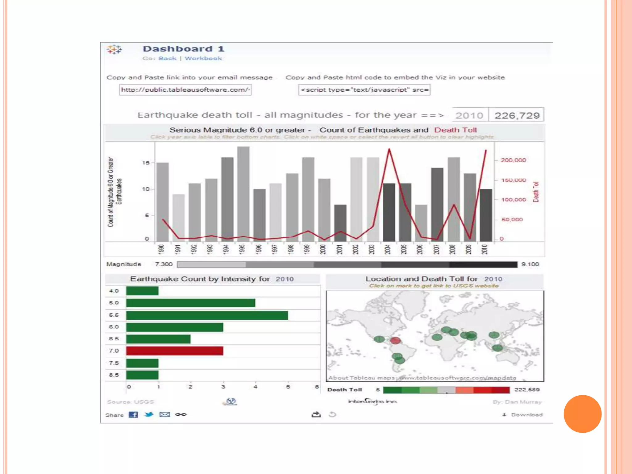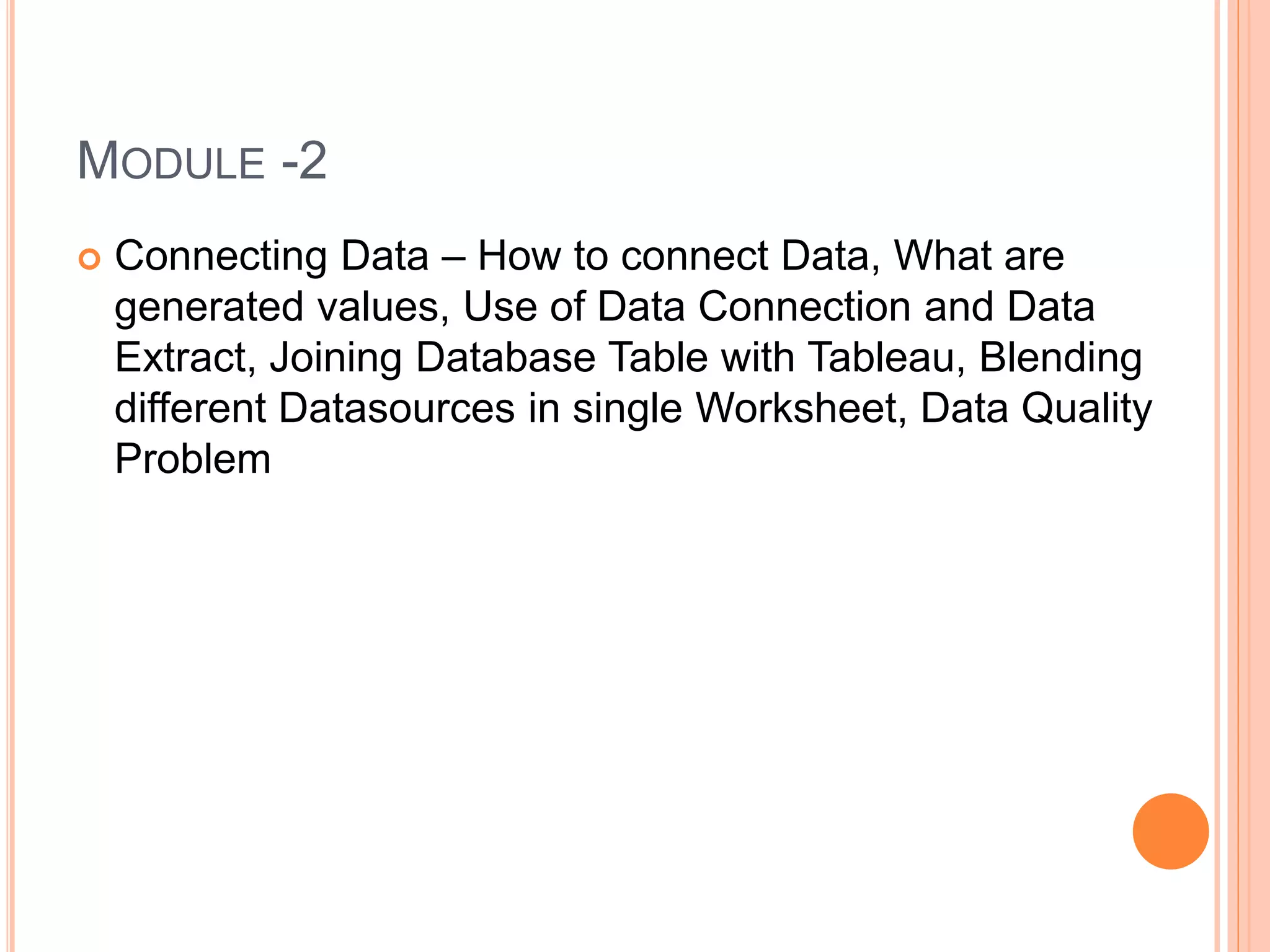 This document discusses data visualization in Tableau. It covers how to connect to different data sources like databases, files, and public data. It describes generated fields, data extracts, and how to join and blend multiple data sources. The document also discusses factors that affect data connection speed and how to deal with common data quality issues like renaming fields, grouping values, handling nulls, and geographic errors.