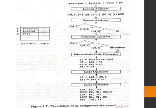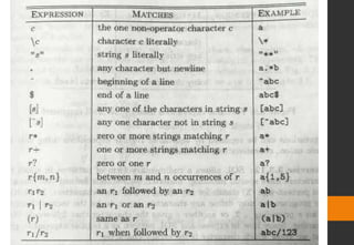 The document discusses lexical analysis in compilers. It begins with an overview of lexical analysis and its role as the first phase of a compiler. It describes how a lexical analyzer works by reading the source program as a stream of characters and grouping them into lexemes (tokens). Regular expressions are used to specify patterns for tokens. The document then discusses specific topics like lexical errors, input buffering techniques, specification of tokens using regular expressions and grammars, recognition of tokens using transition diagrams, and the transition diagram for identifiers and keywords.