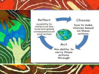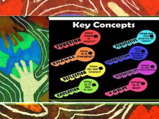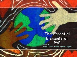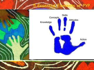 The document outlines the 5 essential elements of the PYP (Primary Years Programme): knowledge, concepts, attitudes, skills, and action. It describes each element in detail, noting that knowledge explores important ideas across subject areas, concepts promote higher-level thinking, attitudes aim to develop values like appreciation and cooperation, skills include thinking, social, communication and research abilities, and action involves applying learning to help others. Together, these elements work to develop international-mindedness in students.
