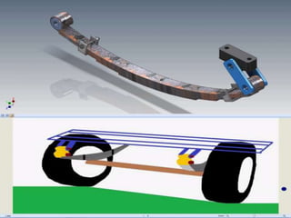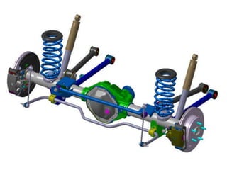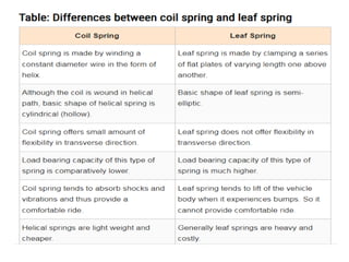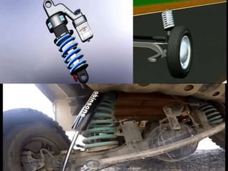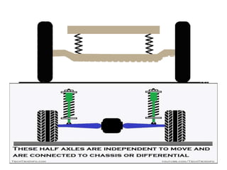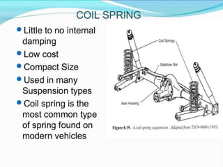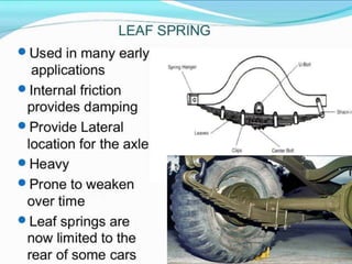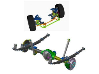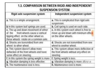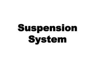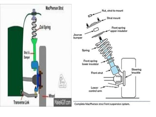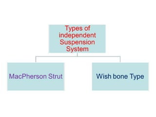 The document discusses different types of suspension systems used in vehicles. It describes non-independent suspension which connects both wheels to the same solid axle, causing one wheel's movement to affect the other. Independent suspension allows each wheel to move independently with minimal effect on the other. Common systems include MacPherson strut suspension which uses a strut and control arm, and double wishbone suspension which uses upper and lower control arms to connect each wheel to the frame. Air suspension replaces metal springs with air bags or bellows to provide a smooth, adjustable ride.