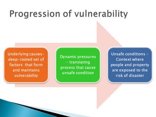 The document discusses reducing vulnerability to hydro-climatic disasters through disaster risk reduction initiatives in Guyana. It emphasizes understanding the relationship between hazards, vulnerability, and risk; evaluating existing disaster risk reduction programs; and promoting knowledge sharing to build resilient communities. Key points include identifying vulnerable populations, dynamics that propagate disasters in Guyana, challenges in effective disaster response, and measures to mitigate water-related disasters through a multi-sectoral approach incorporating disaster risk management into water resource management frameworks.