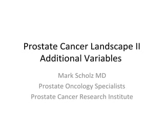 This document discusses the numerous variables involved in prostate cancer treatment decisions. It covers factors like risk level, treatment options for newly diagnosed, recurrent, and advanced prostate cancer. It also addresses how patient characteristics, relationships, personality, and understanding of statistics can influence decisions. Additionally, it outlines the many uncertainties in prostate cancer like rapid technology changes, limitations of studies and doctors, and potential profit motives. The conclusion is that prostate cancer requires considering a man's overall health, relationships, and quality of life when determining the often complex management options.