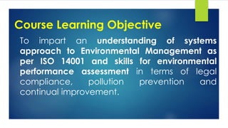 This document provides an overview of the content and objectives of a course on environmental management. The course aims to impart an understanding of the ISO 14001 systems approach to environmental management and skills for assessing environmental performance in terms of legal compliance, pollution prevention, and continual improvement. The course content includes topics like environmental quality objectives, environmental standards, minimum national standards, environmental performance evaluation, and pollution prevention opportunities. It also lists the UN's environmental quality objectives such as reduced climate impact, clean air, a non-toxic environment, and others.